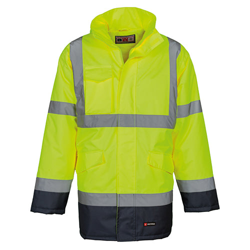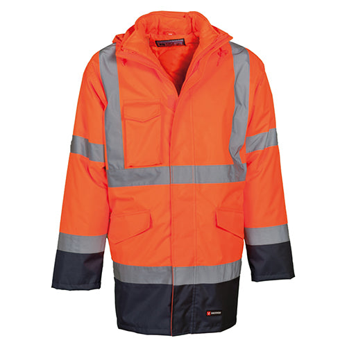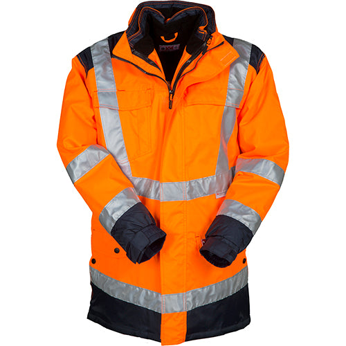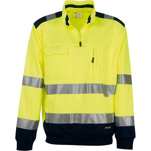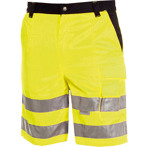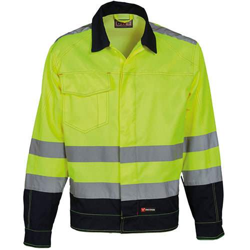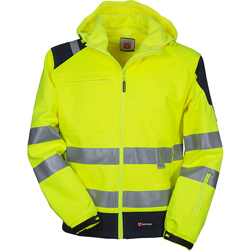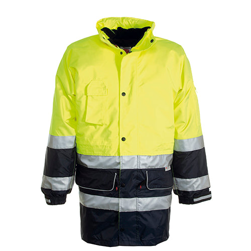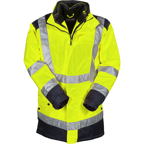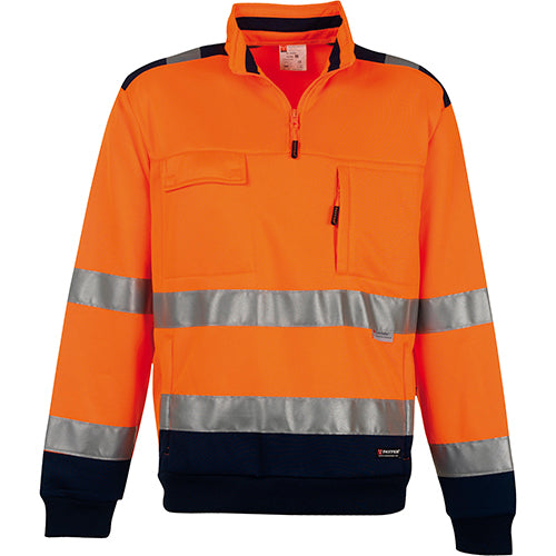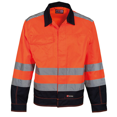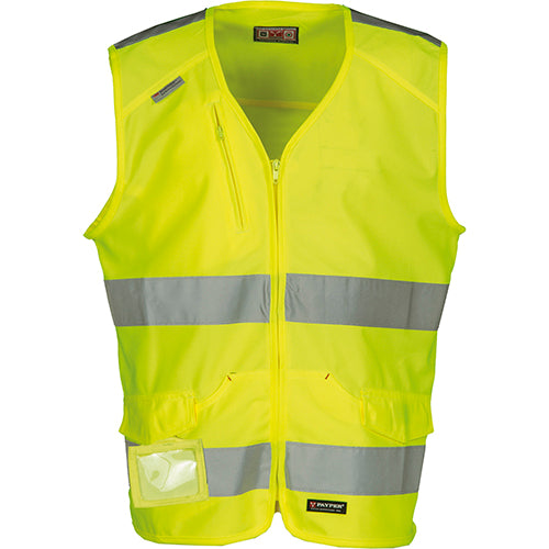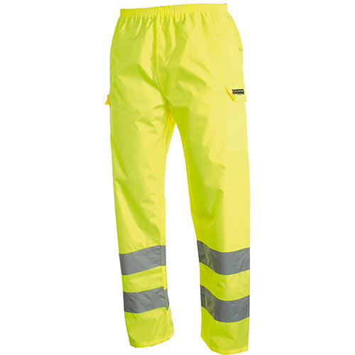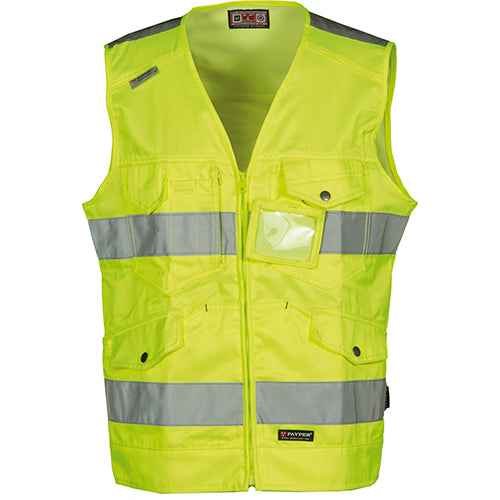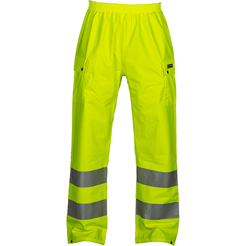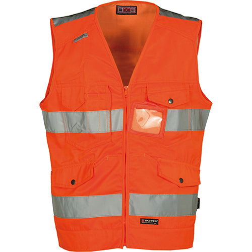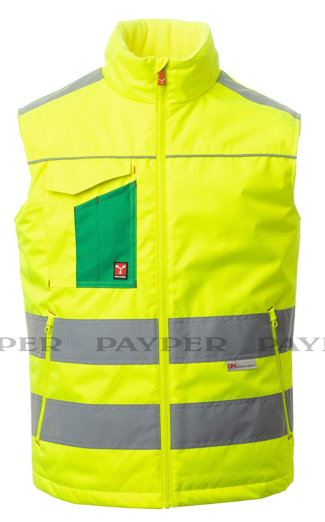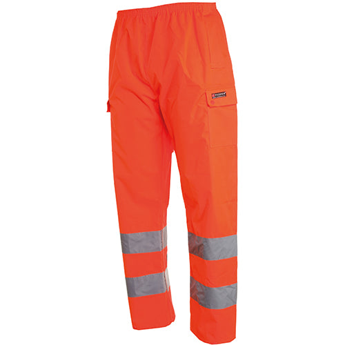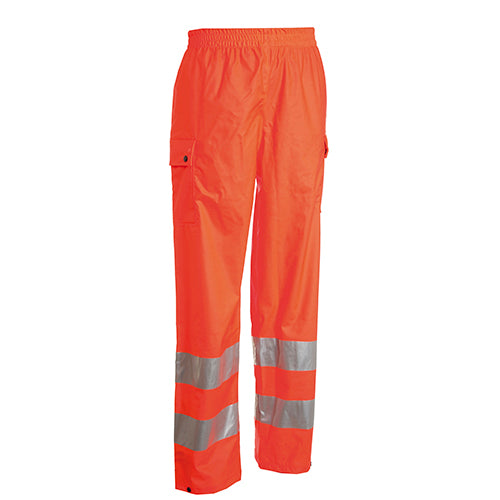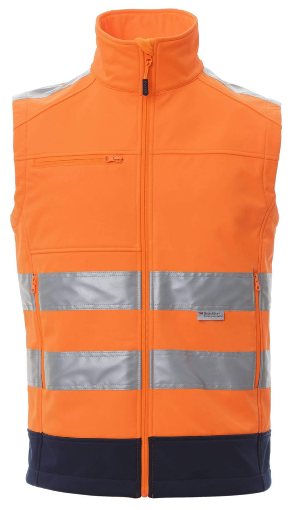 Pantalone unisex, “4 way stretch”, multistagione, in alta visibilità, con elastici laterali e passanti in vita, chiusura con zip e bottone personalizzato. Sul davanti ha due tasche arrotondate, un taschino porta monete a destra, un taschino di sicurezza chiuso con zip a sinistra. Sul fronte della gamba sinistra presenta 3 tasche: una tasca orizzontale chiusa da una zip, una tasca con patta sagomata chiusa con velcro e dotata di portabadge, una tasca piccola verticale chiusa con zip. Sul fronte della gamba destra è presente una banda retroriflettente. Sul retro sono presenti: una tasca con pattina chiusa con velcro e una tasca senza pattina ma con 2 bande retroriflettenti, un anello porta martello (gamba destra), una tasca aperta porta metro (gamba destra) e una tasca porta smartphone con patta e velcro (gamba destra), inserti retroriflettenti all’altezza del ginocchio su entrambe le gambe, battitacco in tessuto a contrasto (entrambe le gambe). Bande retroriflettenti segmentate e termosaldate, per agevolare i movimenti. Impunture laterali e travette di rinforzo a contrasto in vari punti.