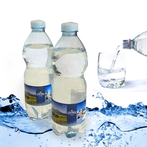 Bottiglietta con acqua minerale naturale o frizzante in PET da 0,5L con etichetta personalizzata in quadricromia.