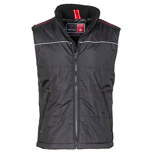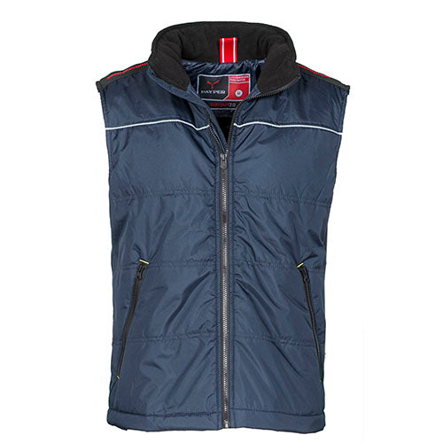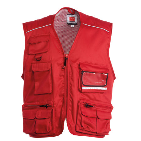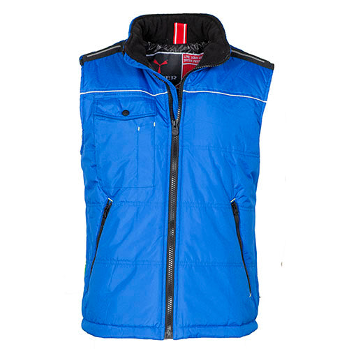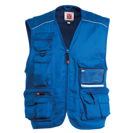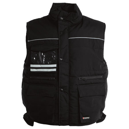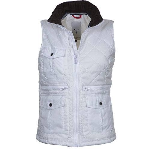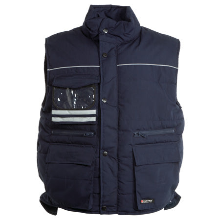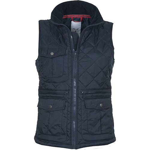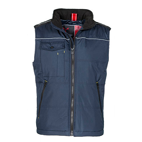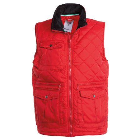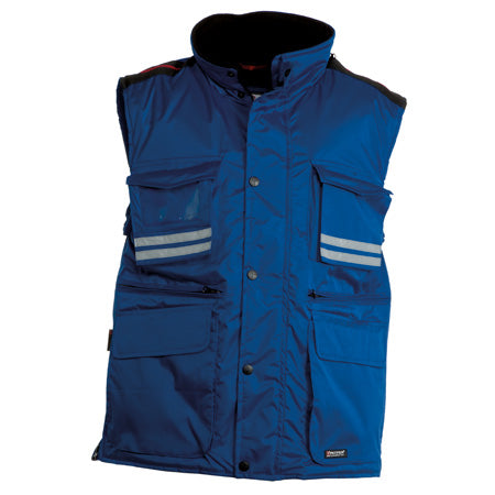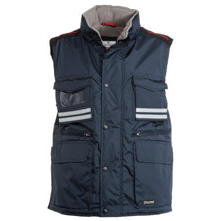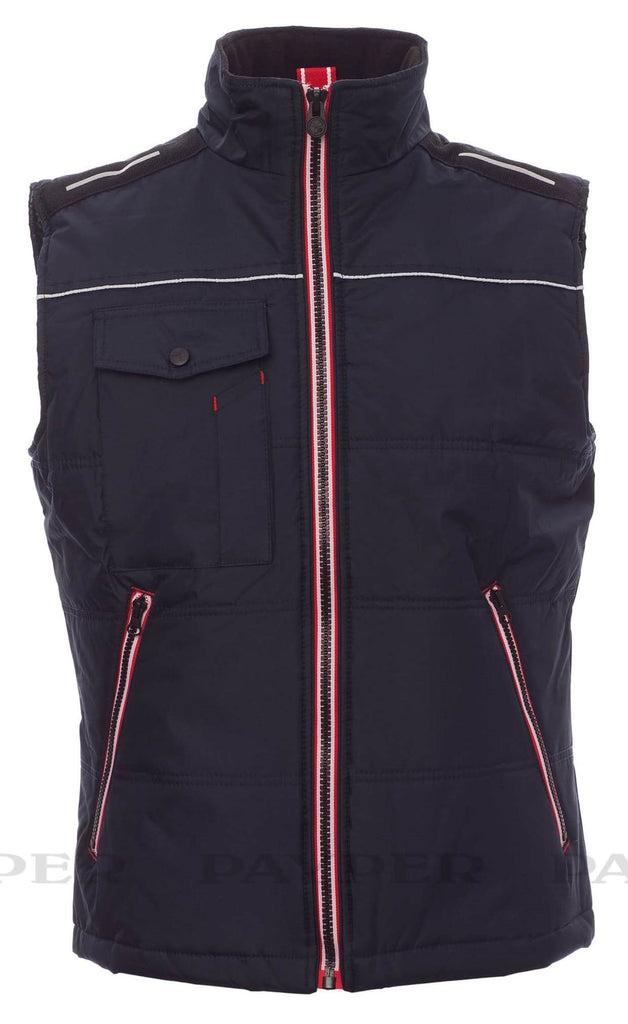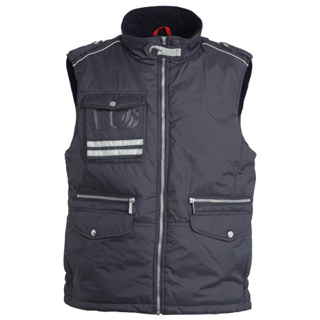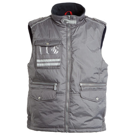 Gilet ergonomico da donna, zip 8 mm in plastica con cursore in metallo con patta e bottoni in plastica, cappuccio sagomato staccabile e/o richiudibile nel colletto, bande riflettenti grigie fronte e retro, spacchetto laterale con soffietto e zip, nove tasche esterne di cui due LOCK SYSTEM, due con zip e interno rinforzato, una con porta badge reversibile. Interno: imbottito, colletto, schiena e scalda reni in micropile, coulisse in vita e zip interna per agevolare stampe e ricami.