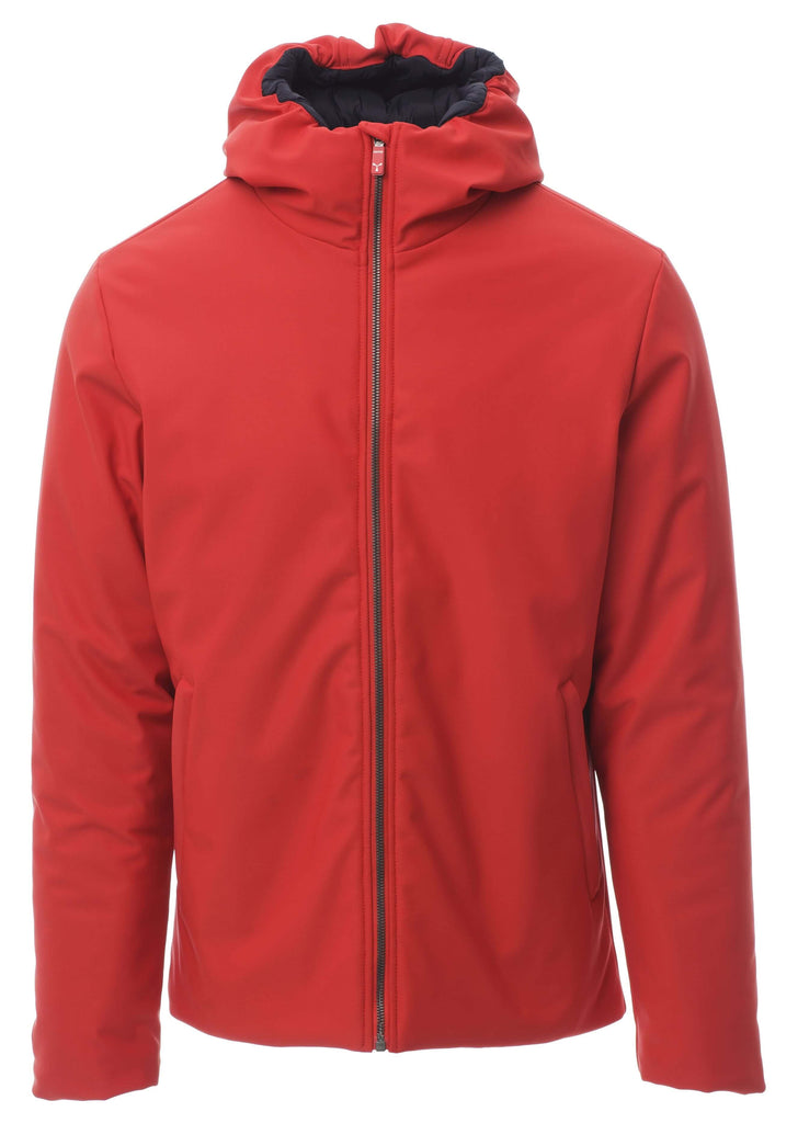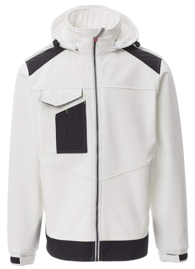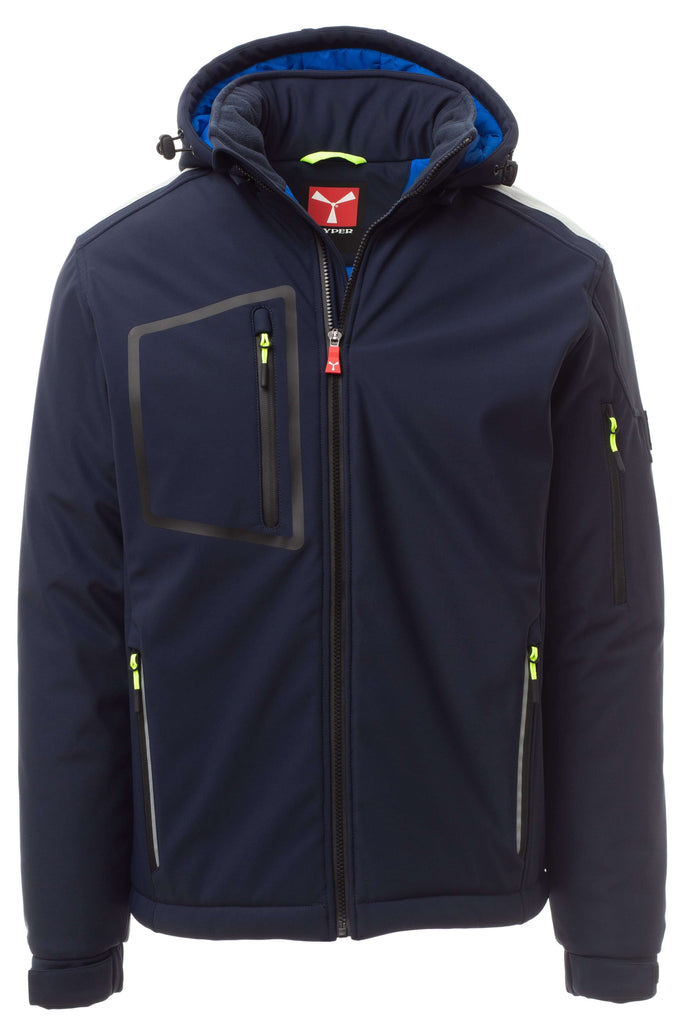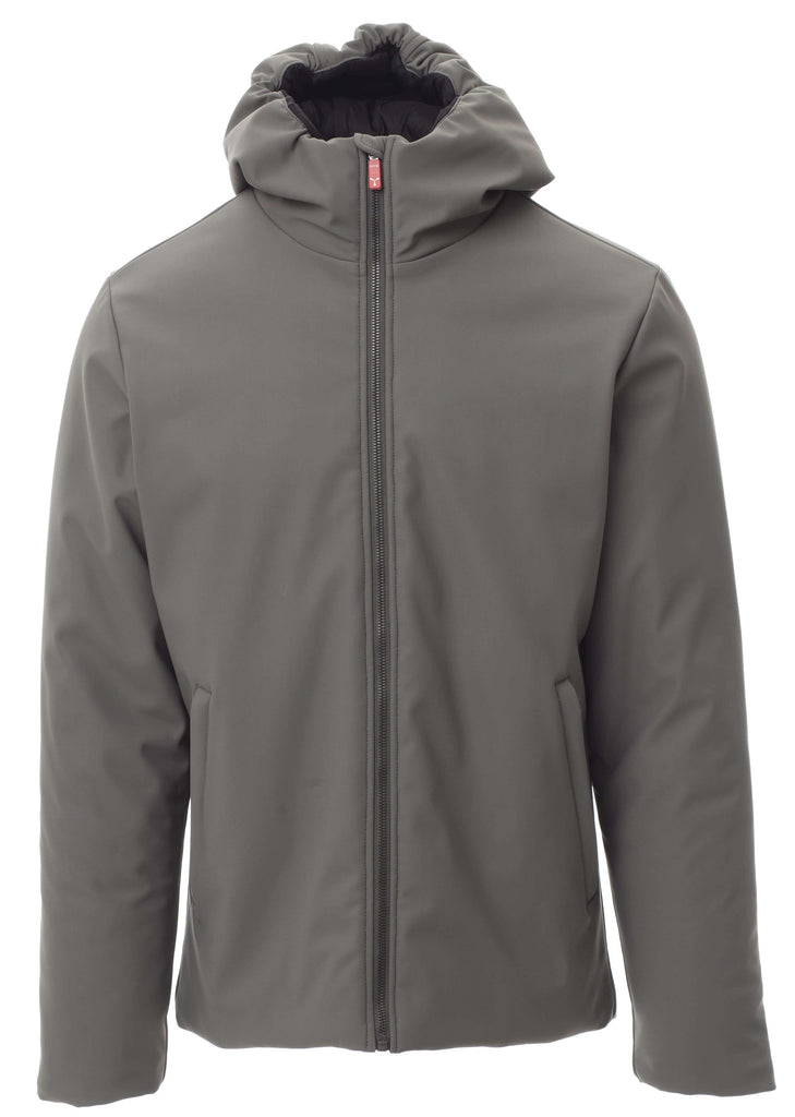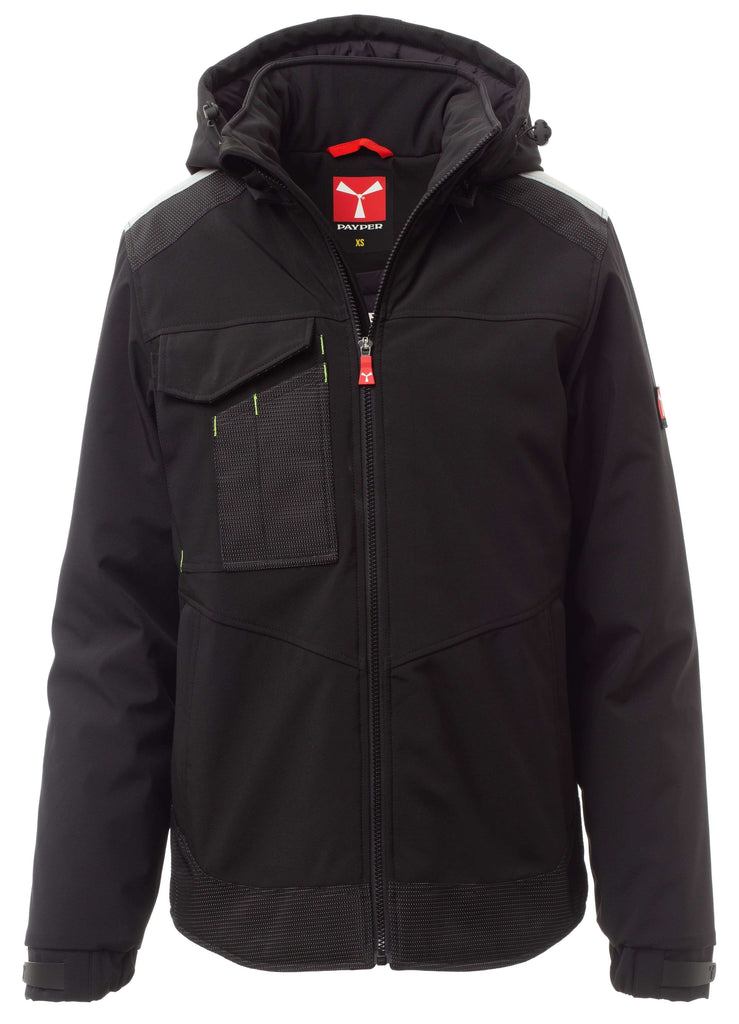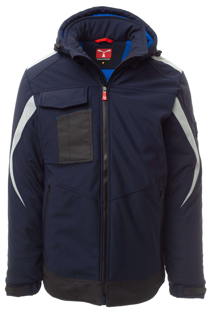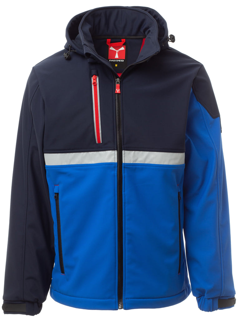 WP 8000 mm H₂O, WVT 5000 g/m² 24h. Giacca ergonomica da uomo bicolore, zip lunga SBS nastrata, cappuccio richiudibile nel colletto, polsini regolabili con stringi polso gommati e velcro, due tasche laterali con zip, una tasca al petto con porta badge a scomparsa, una tasca skipass al braccio, coulisse in vita.