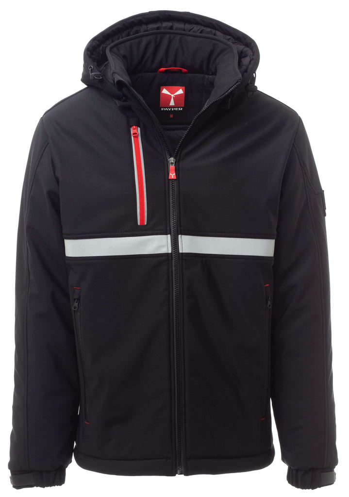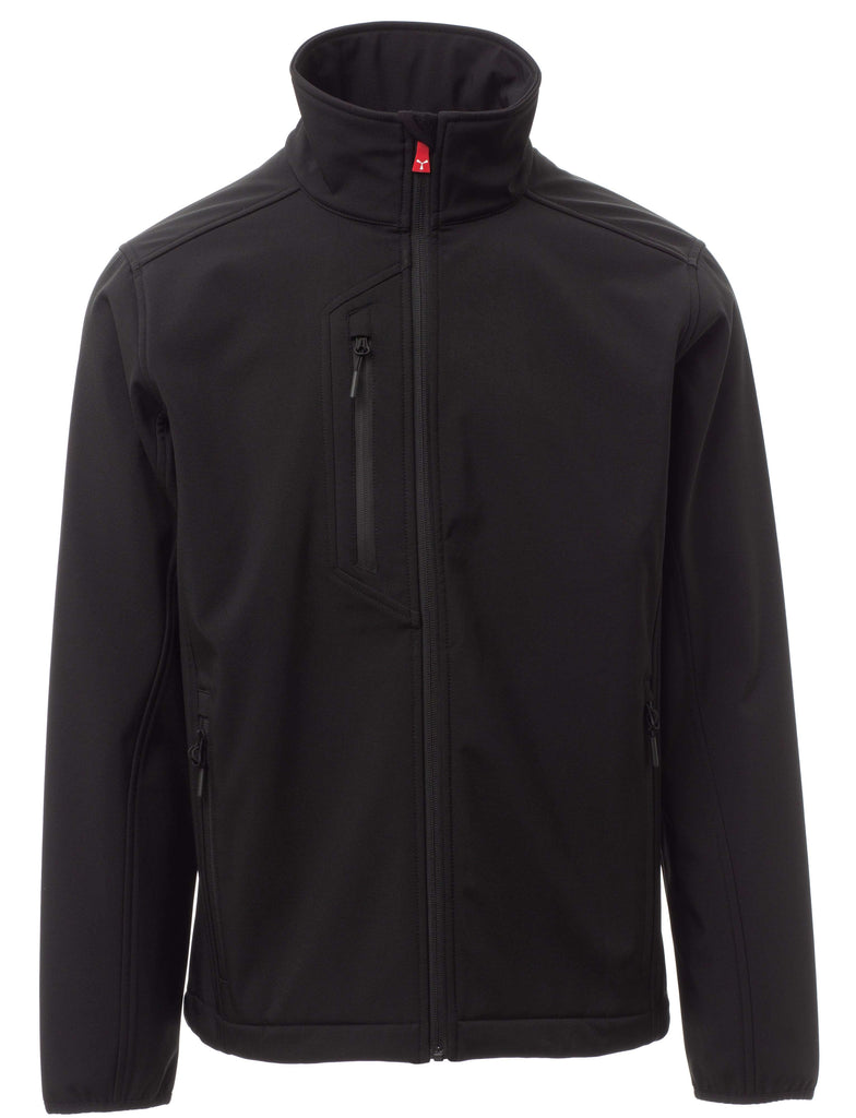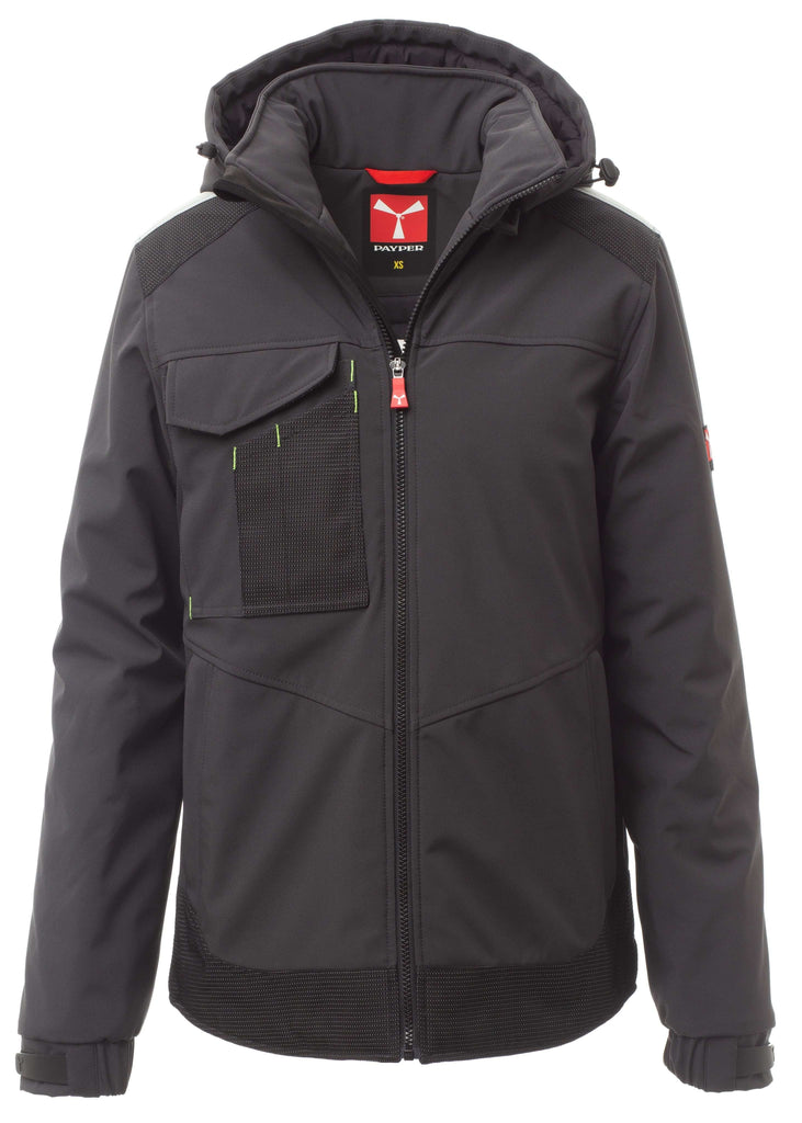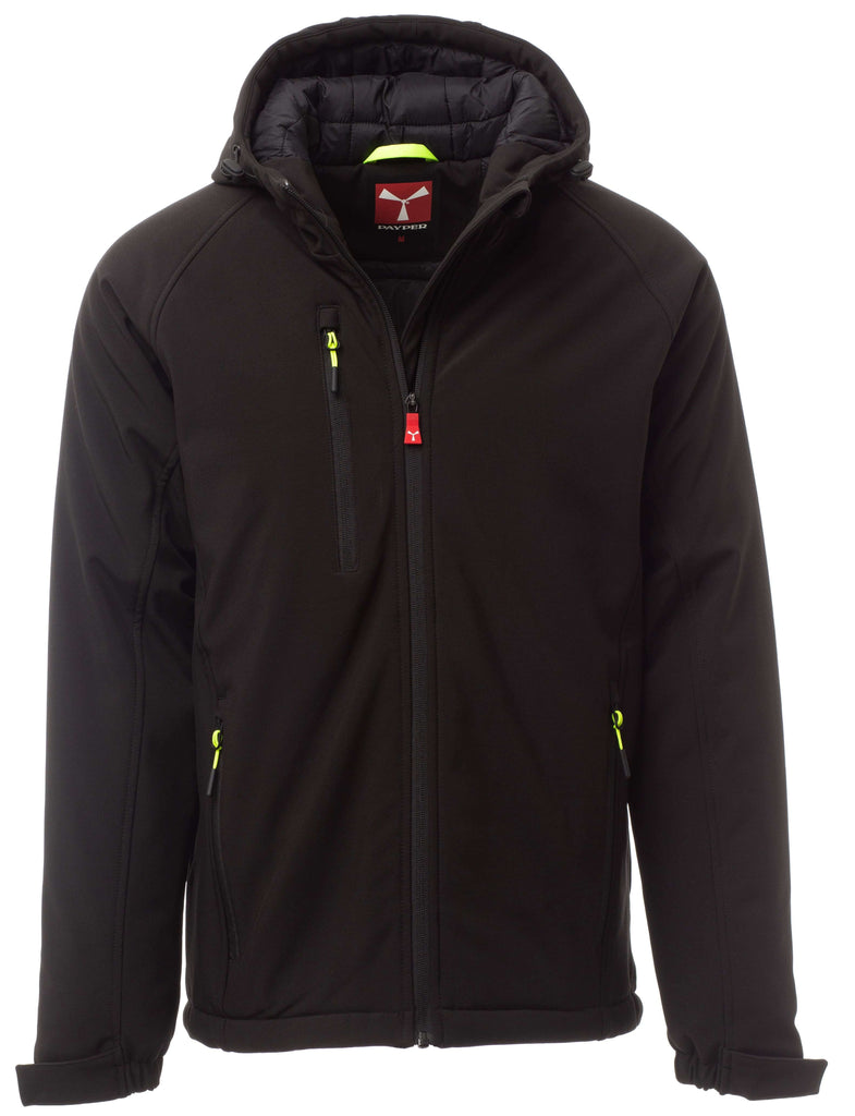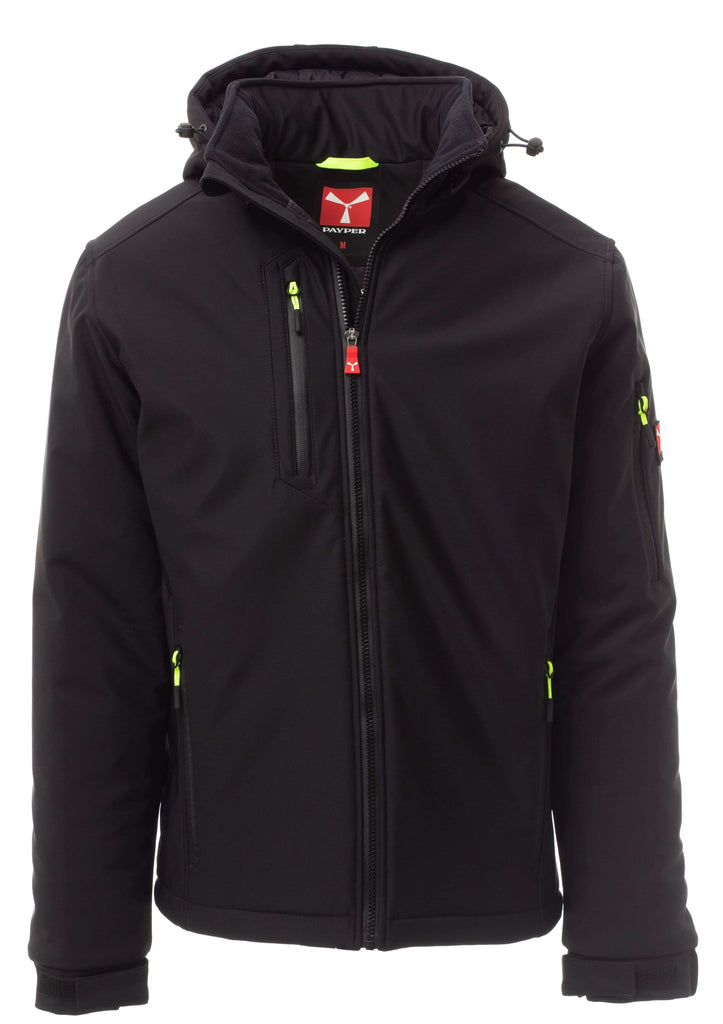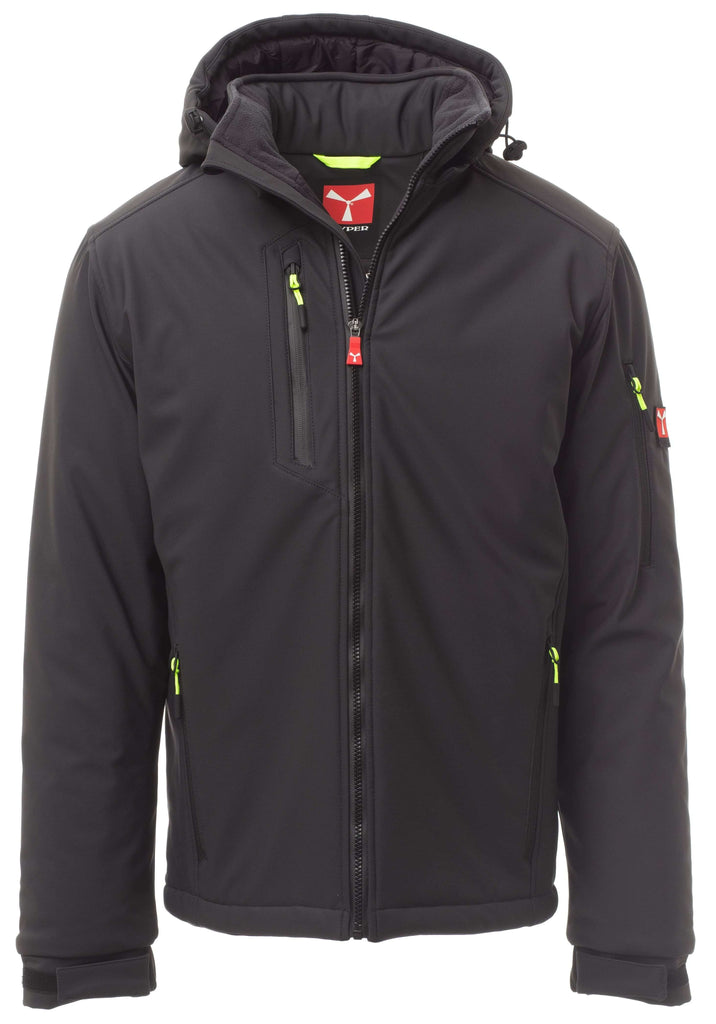 WP 8000 mm H₂O, WVT 5000 g/m² 24h. Giacca ergonomica da uomo bicolore, zip lunga SBS nastrata, cappuccio richiudibile nel colletto, polsini regolabili con stringi polso gommati e velcro, due tasche laterali con zip, una tasca al petto con porta badge a scomparsa, una tasca skipass al braccio, coulisse in vita.