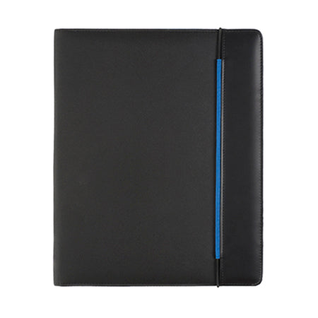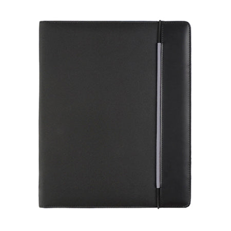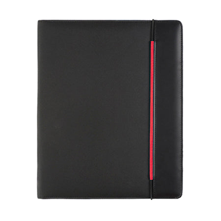 Padfolio in morbida microfibra nera con un elastico di chiusura colorato abbinato al colore dell'interno. Asola per penna. asola per USB e blocco inclusi.