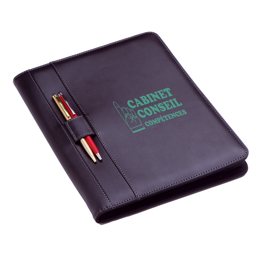 Comprende un blocchetto di carta, due asole per penne e una tasca a bustina.