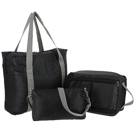 E' il set ideale per viaggiare. Leggero e pieghevole, include un'ampia borsa per la spesa con cinghia posteriore da agganciare al trolley, una borsa per scarpe e una borsa per gli effetti personali.