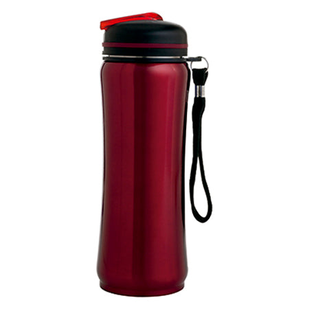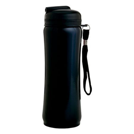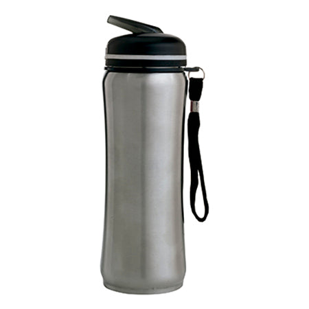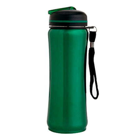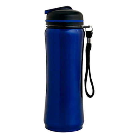 Moderna bottiglia in acciao in colori metallici. Beccuccio apri e bevi. Laccetto per un facile trasporto.