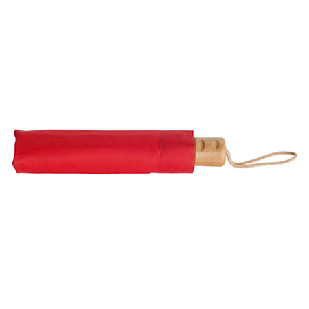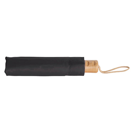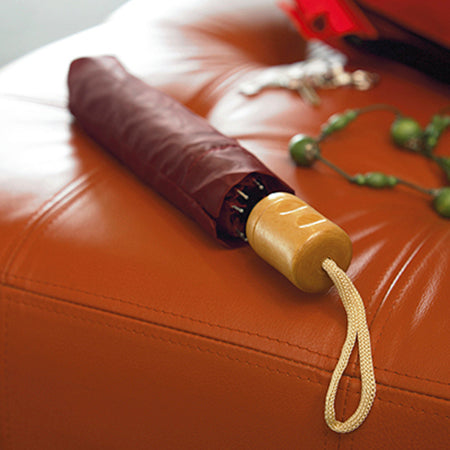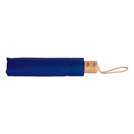 Piccolo ombrello pieghevole ad apertura manuale con manico in legno, raggi in metallo e cinghia per polso.