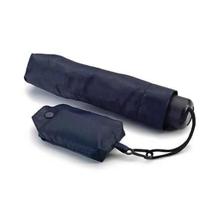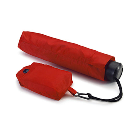Ombrello di 95 cm ad apertura manuale con custodia e borsa pieghevole fissata a un moschettone in plastica.