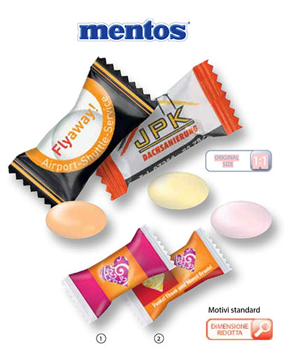 Mentos confetti confezionati singolarmente con carta bianca o trasparente personalizzata.