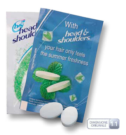 Pastiglie di menta piperita senza zucchero, ovali 19 x 13 mm. Confezionati in busta personalizzata bianca.