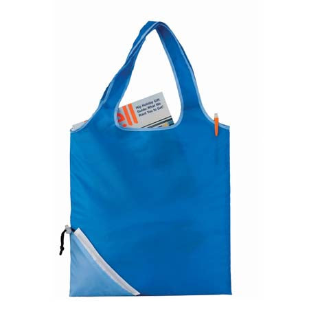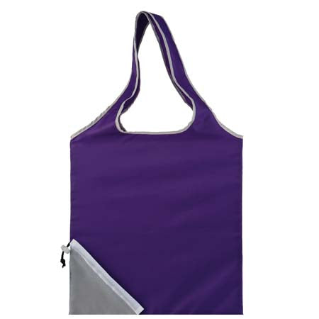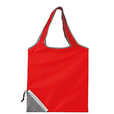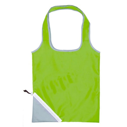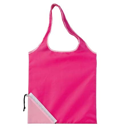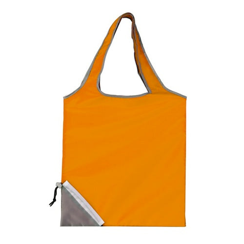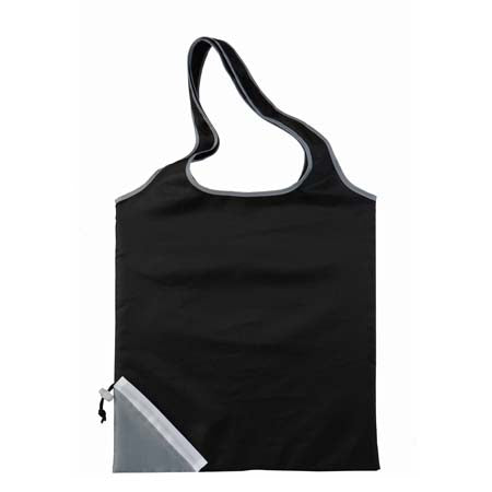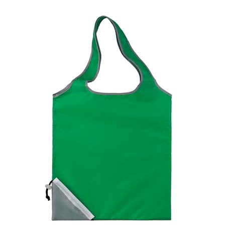 Borsa per spesa pieghevole con ampio scomparto principale e manici a spalla. La borsa si ripiega dentro l'angolo inferiore e resta all'interno grazie alla chiusura trasparente sulla coulisse.