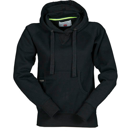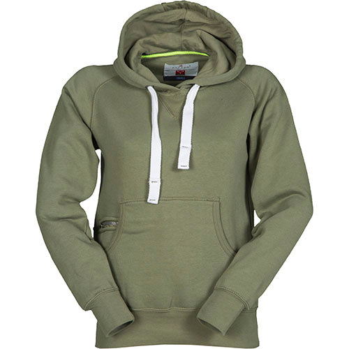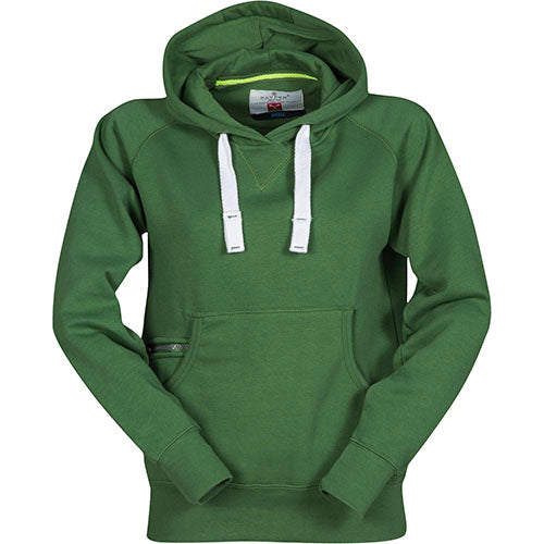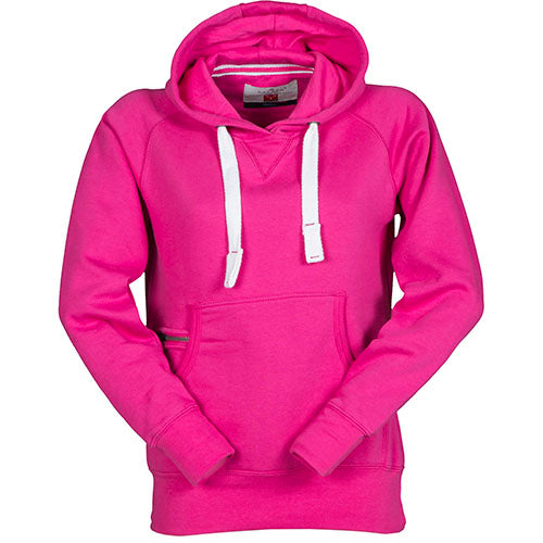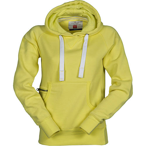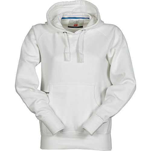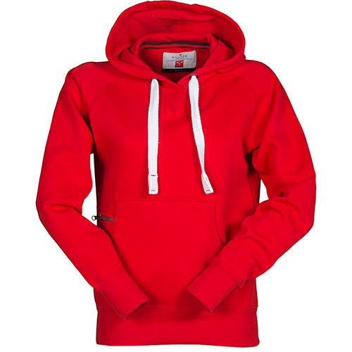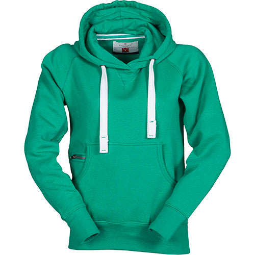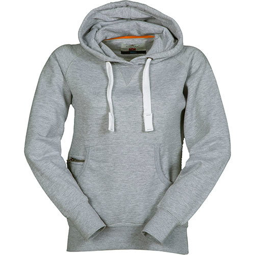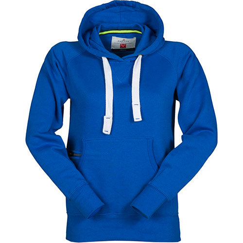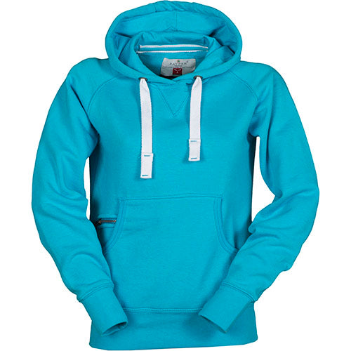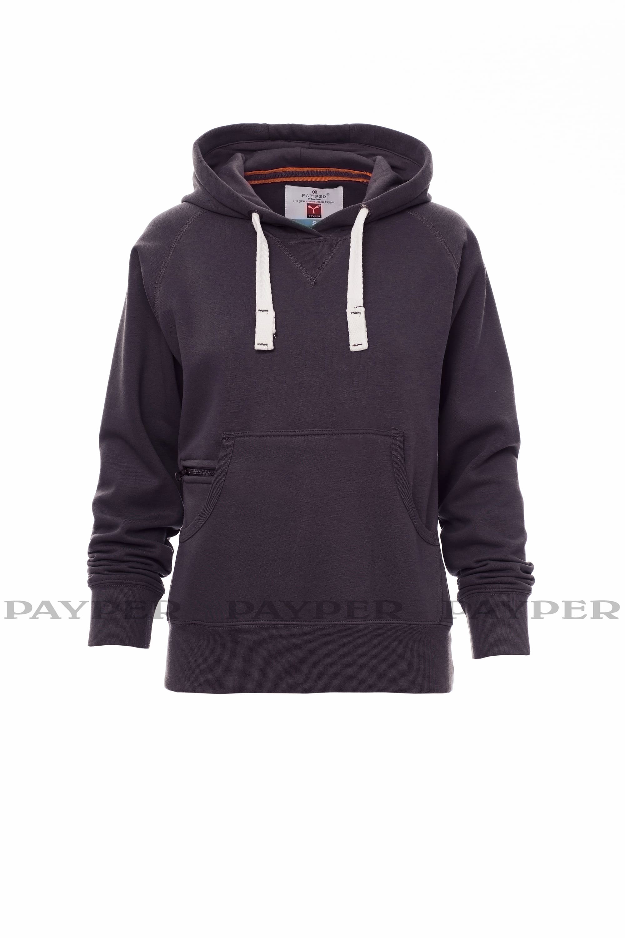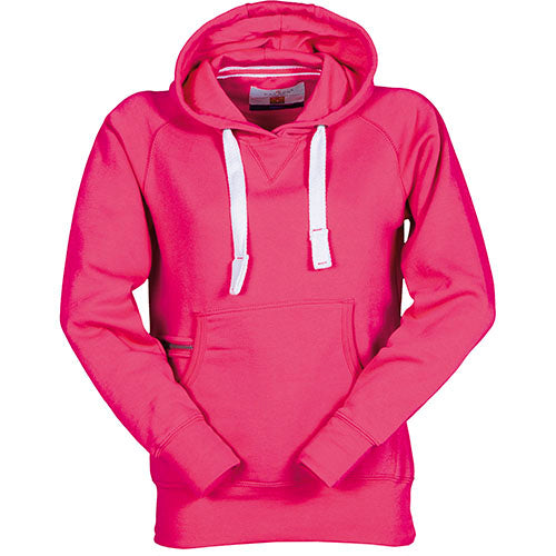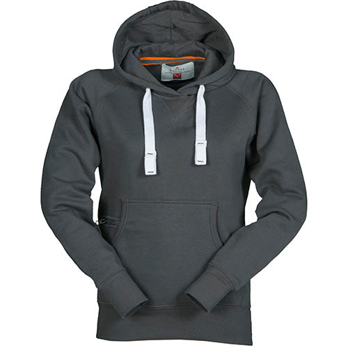 Felpa sfiancata da Donna con cappuccio a due cuciture e coulisse bianca in corda con cuciture in tintacon la felpa e anello in metallo, manica raglan, cucitura estetica a V al collo, tasche a marsupio, taschino con zip, polsini e vita in costina elasticizzata, cuciture rinforzate.