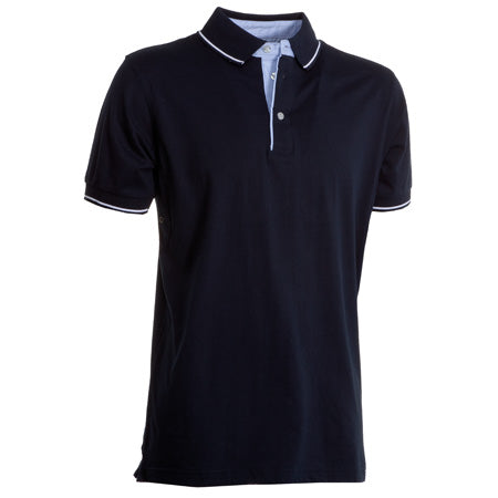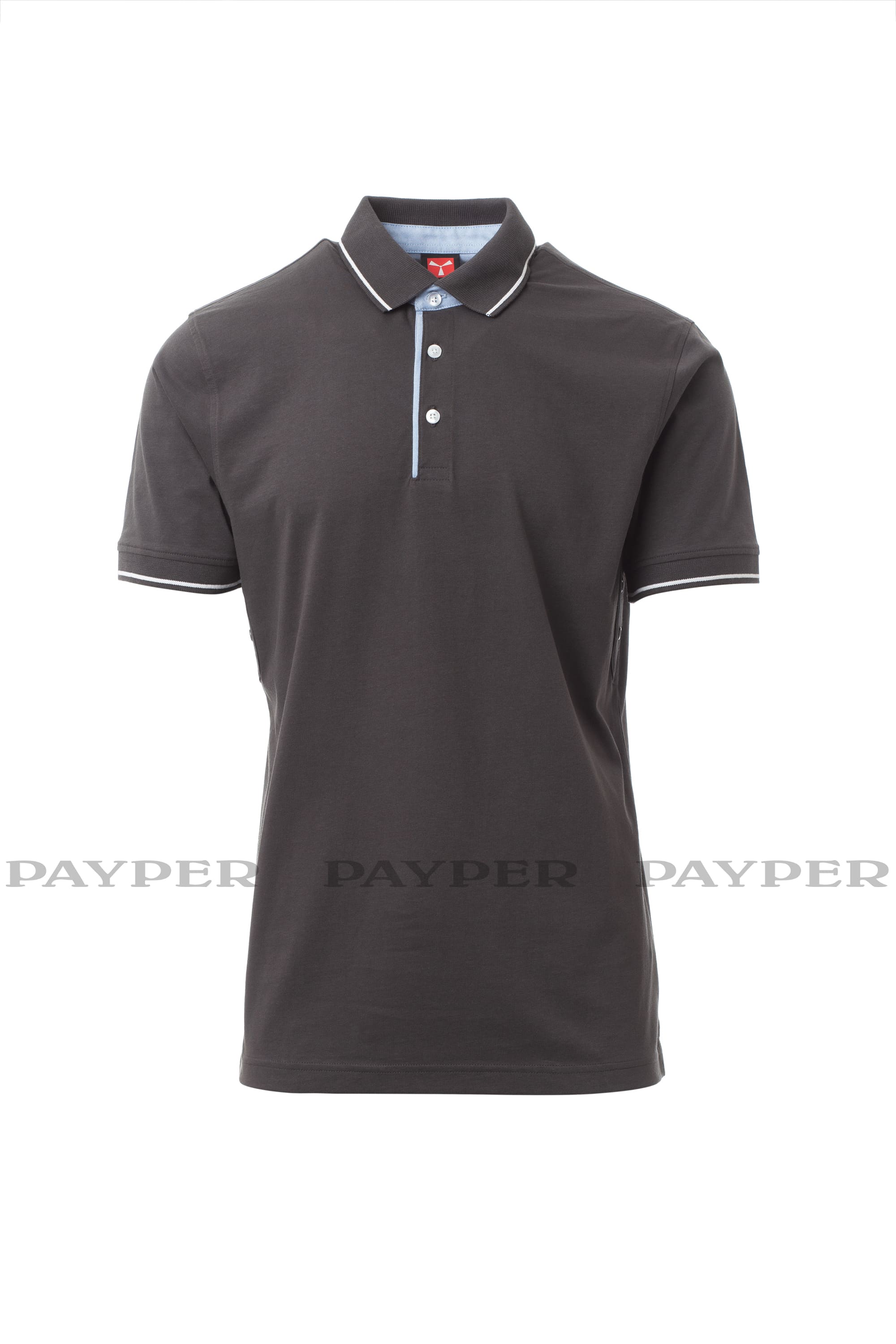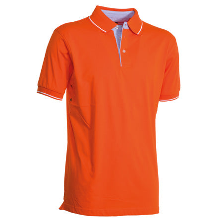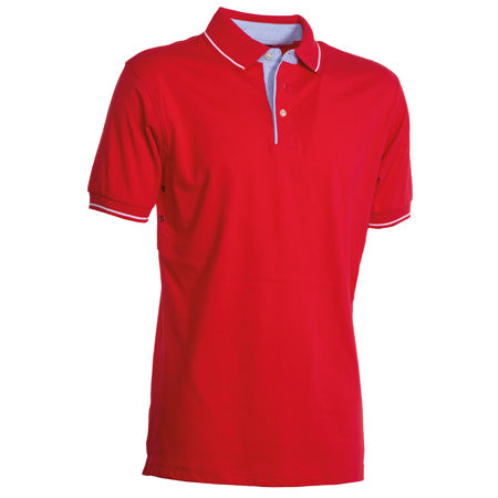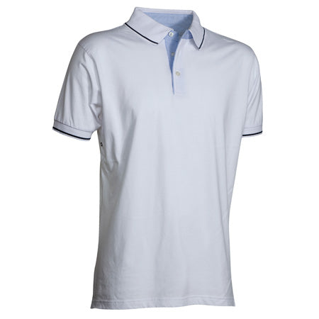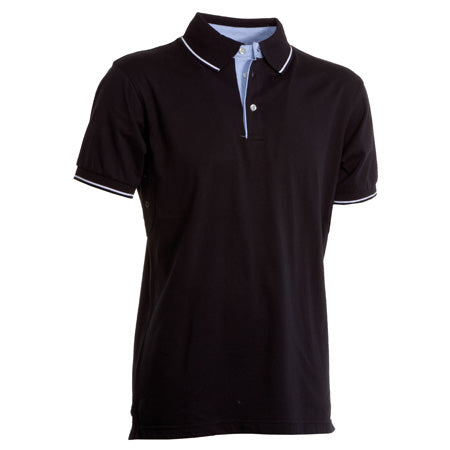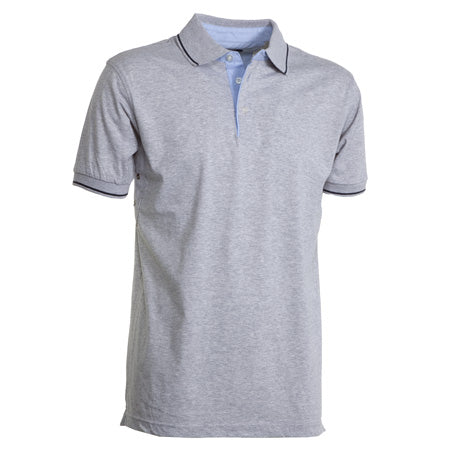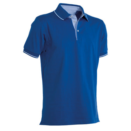 Polo a manica corta a 3 bottoni, con interno collo, patta e spacchetti laterali in Oxford celeste, colletto e bordo manica in rib con fine profilo a contrasto, occhielli sotto braccio.