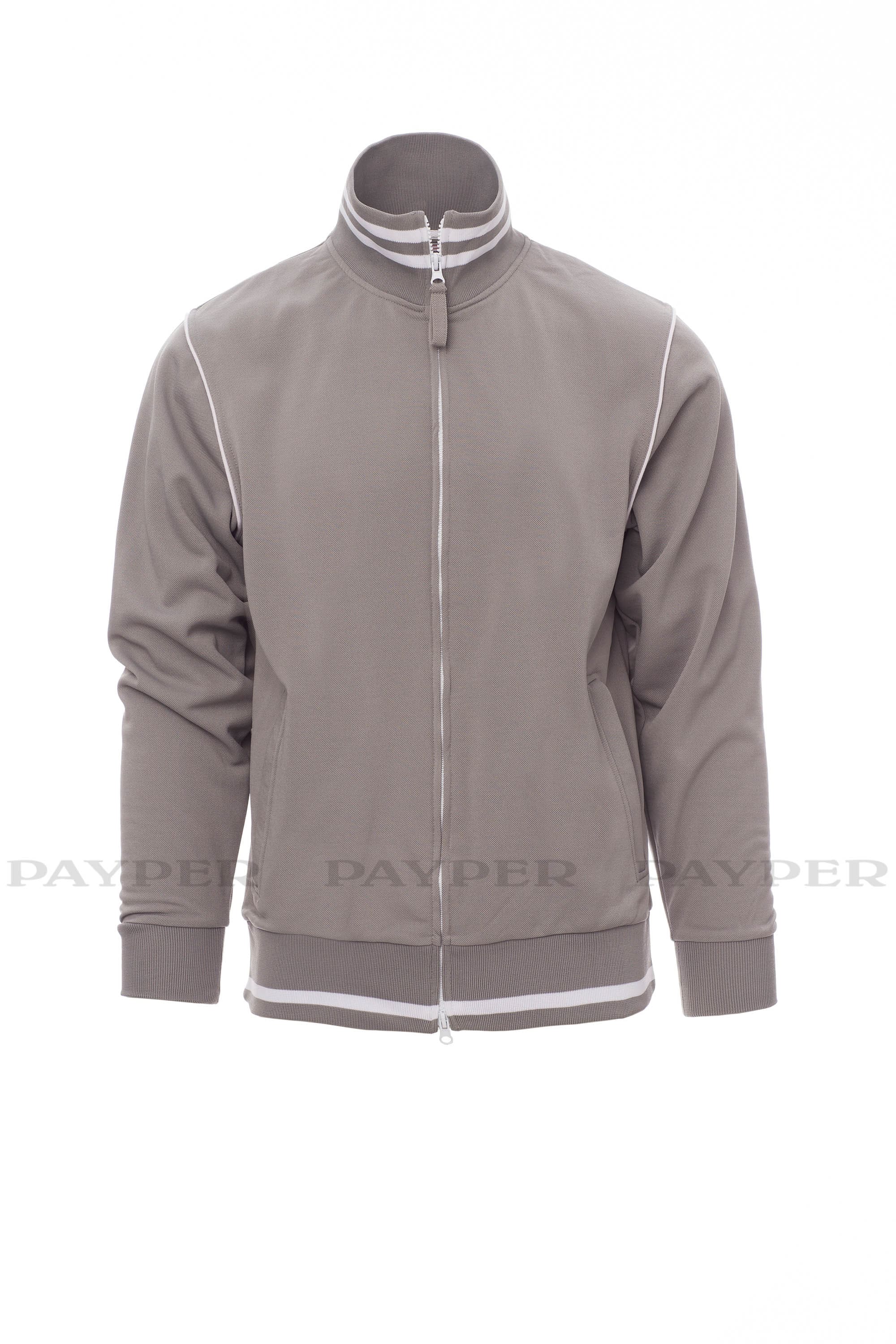 Felpa a zip intera coperta a doppio cursore con colletto, polsini e vita in costina elasticizzata, due righe in contrasto nell‘esterno del collo, una in vita e pipping nel giromanica, due tasche con zip, cuciture rinforzate, nastratura del collo a contrasto, lavorazione a piquet traspirante esterna.