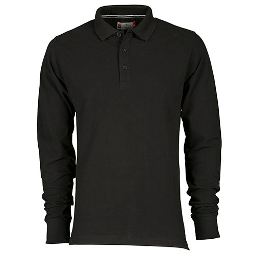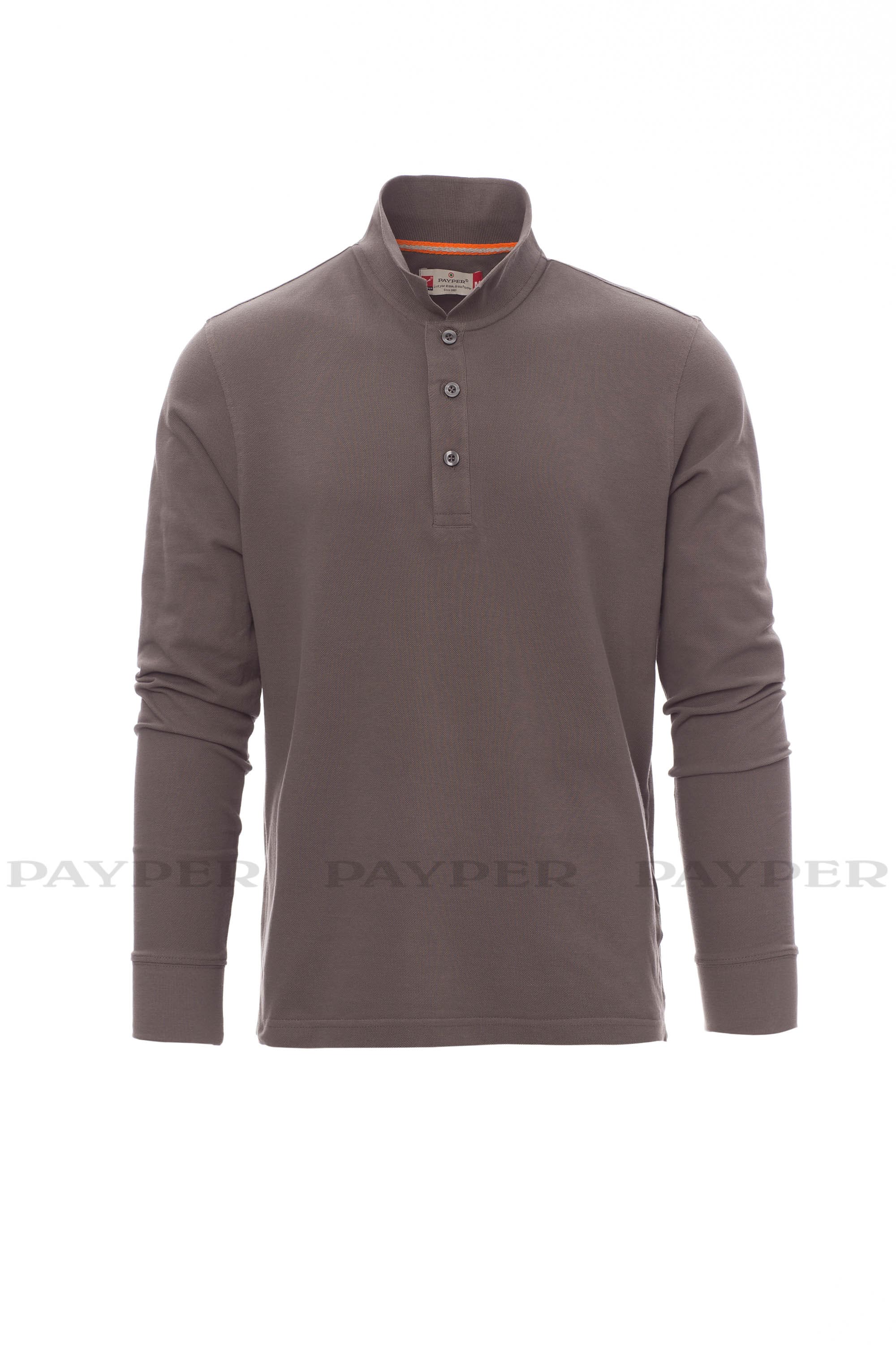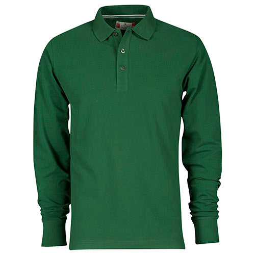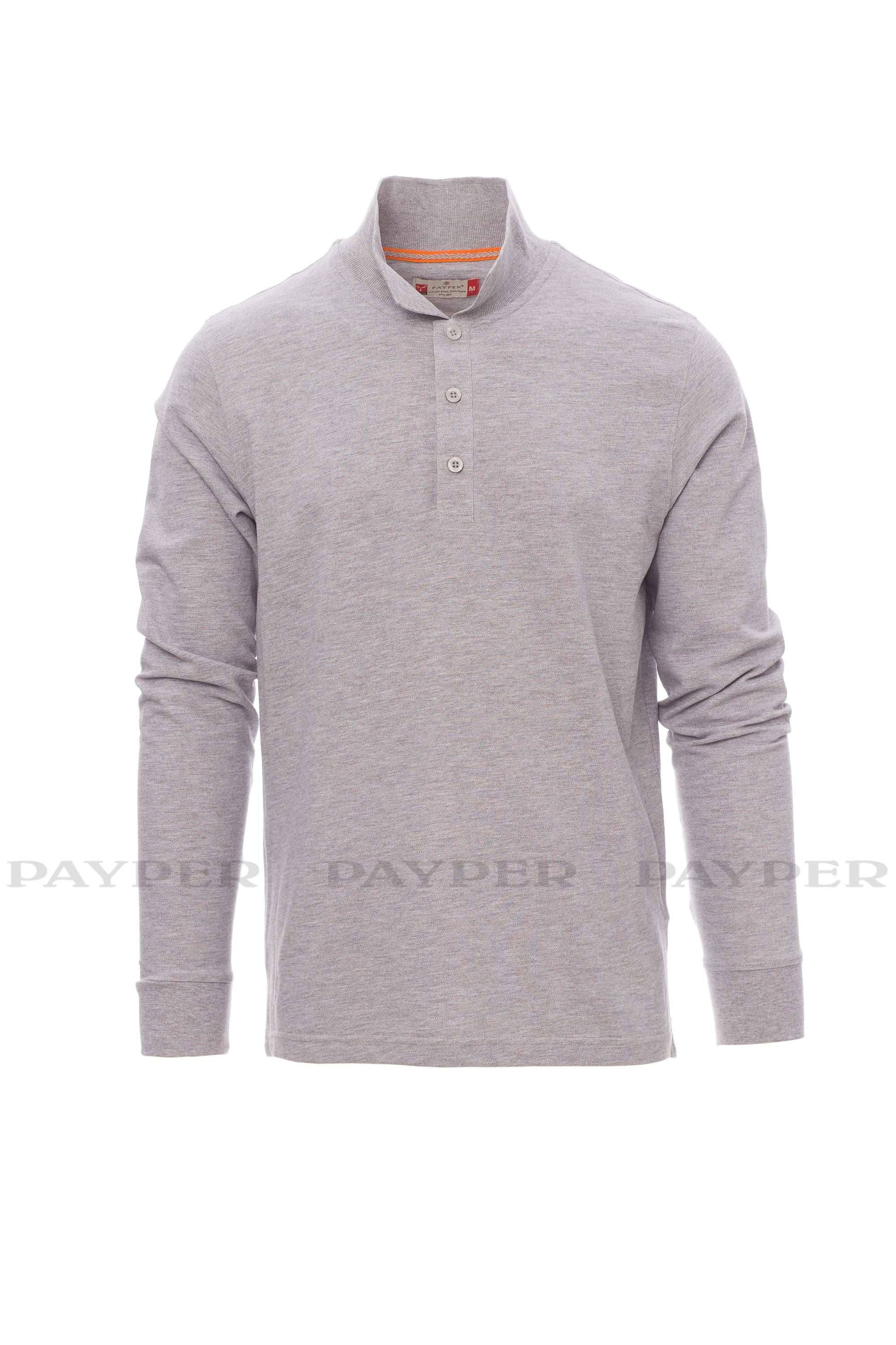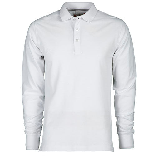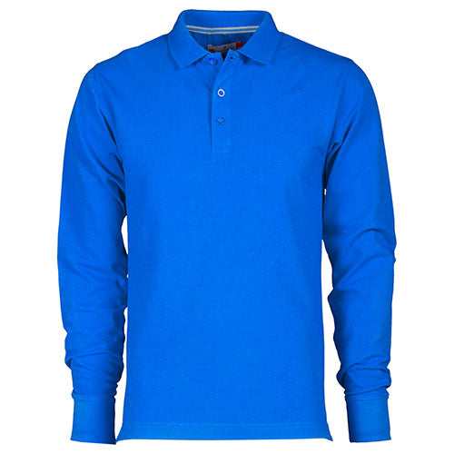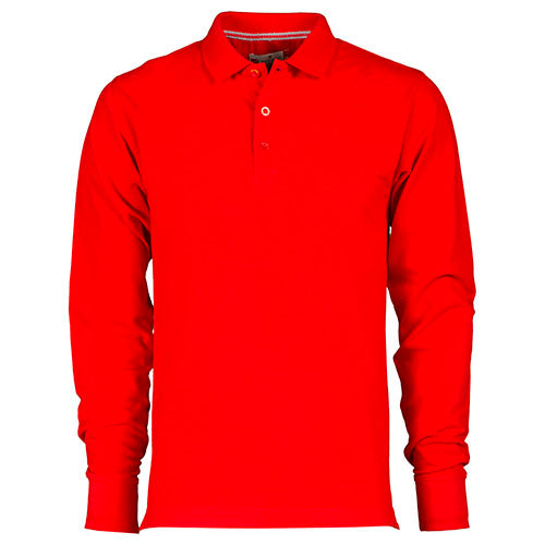 Polo da uomo a manica lunga con 3 bottoni in tinta effetto perlato, colletto e polsino a costine, spacchetti laterali, cuciture del collo coperte con nastro a contrasto, cuciture stretch, nastro di rinforzo laterale, rinforzo sagomato retrocollo.