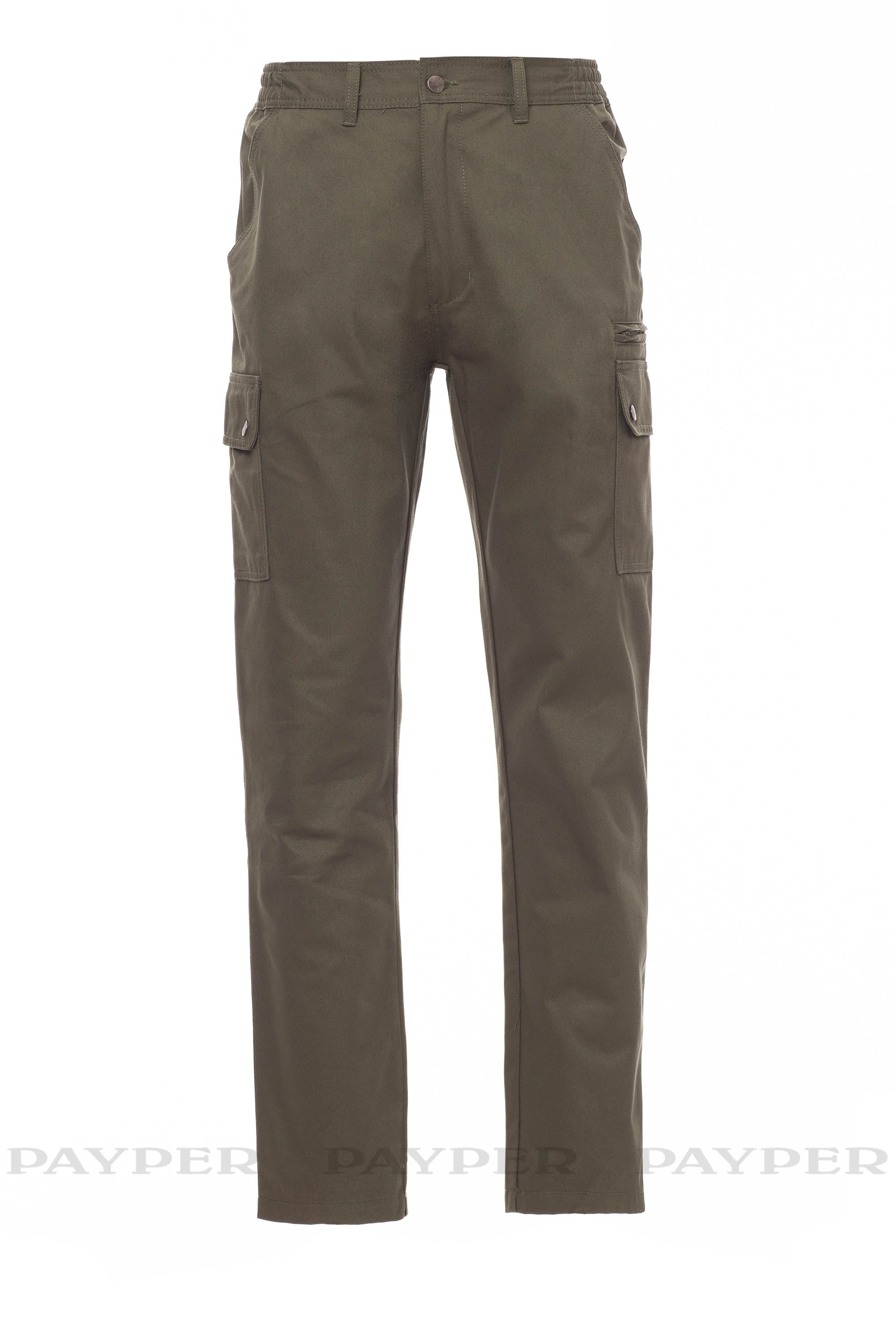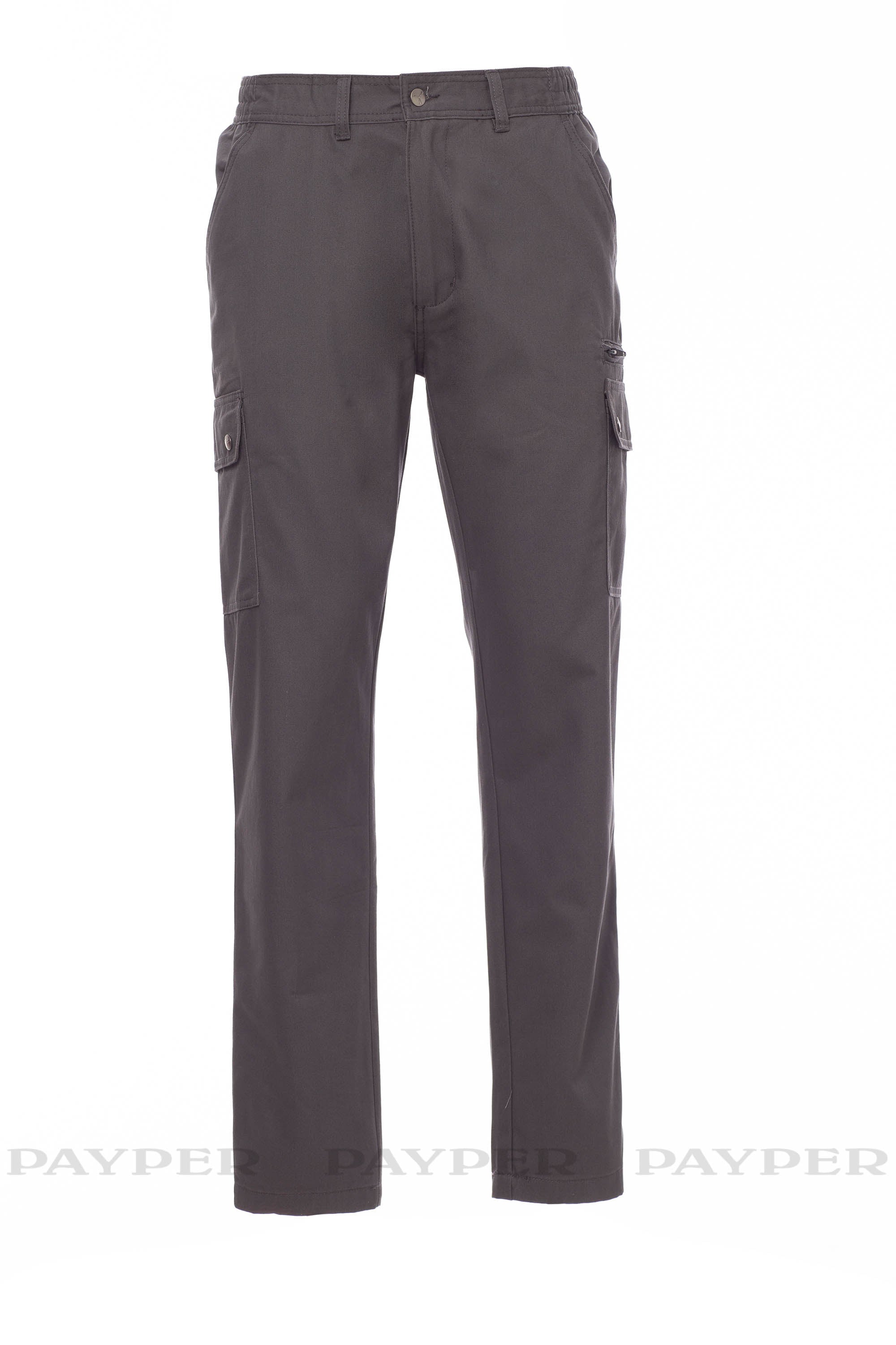 Pantalone multistagione con elastici laterali e passanti in vita, chiusura con zip e bottone in metallo con due tasche antariori a taglio classico, due tasconi laterali con patta e bottoni automatici, una tasca secur zip lato sinistro, un portametro s scomparsa lato destro, due tasche posteriori a filo con asola e bottone.