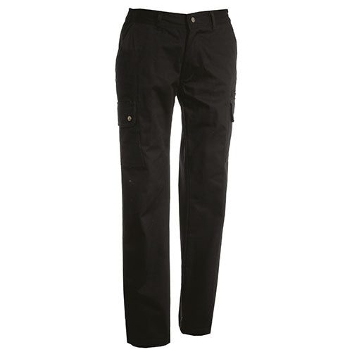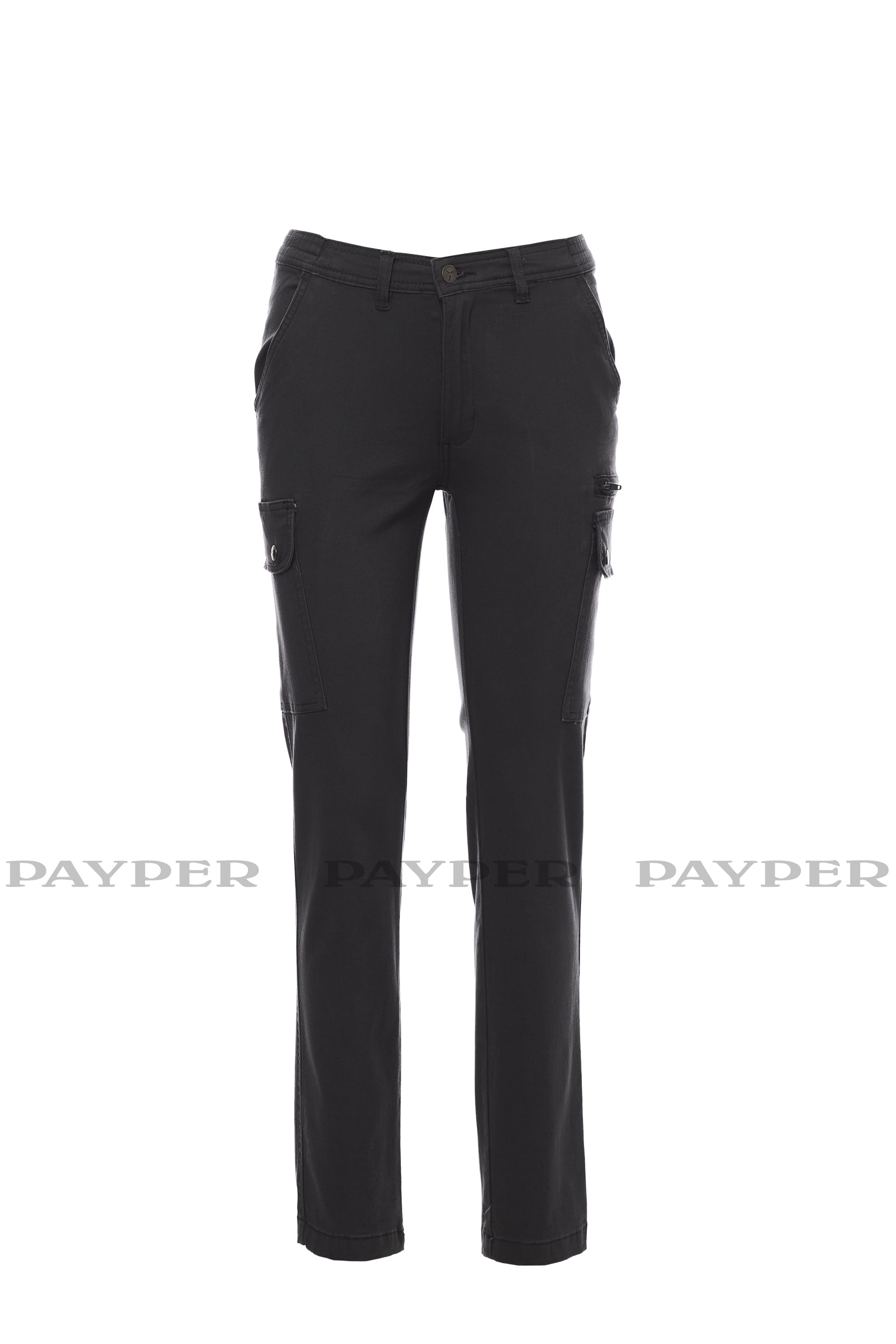 Pantalone donna stretch a taglio classico multistagione con elastici laterali e passanti in vita, chiusura con zip e bottone in metallo con due tasche anteriori a taglio classico, due tasconi laterali con patta e bottoni automatici, una tasca secur zip lato sinistro, un portametro a scomparsa lato destro, due tasche posteriori a filo con asola e bottone.