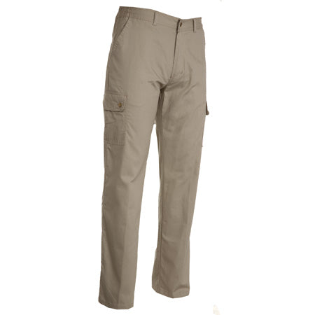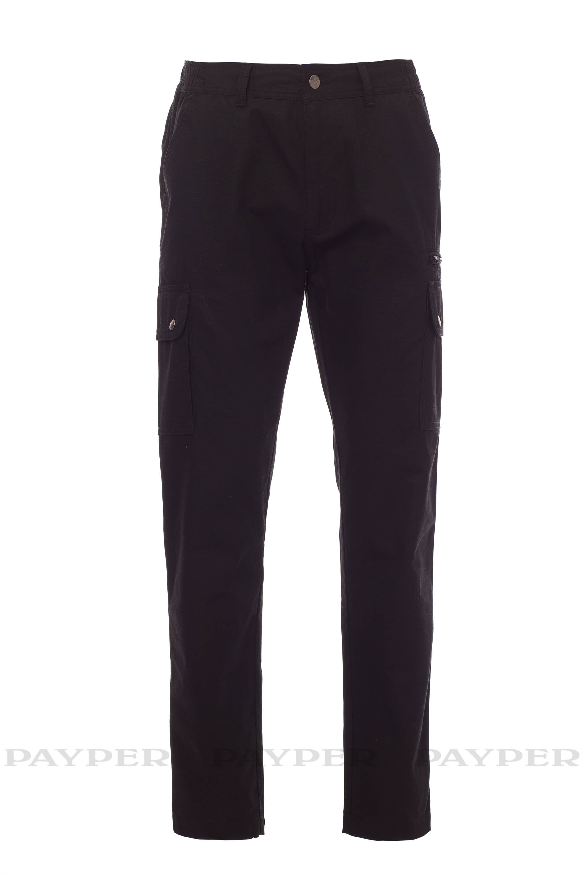 Pantalone uomo, estivo, elastici laterali e passanti in vita, chiusura con zip e bottone in metallo, due tasche anteriori a taglio classico, due tasche laterali con patta e bottoni automatici, una tasca con zip lato sinistro, un porta metro a scomparsa lato destro, due tasche posteriori a filo con asola e bottone.