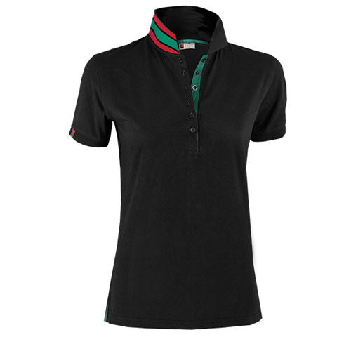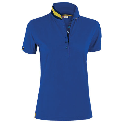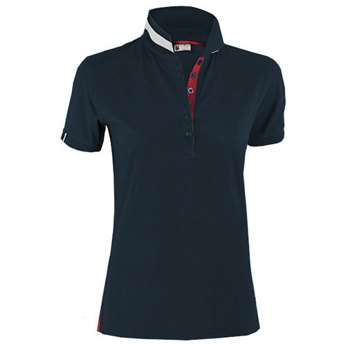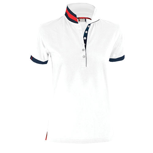 Polo sfiancata da Donna a manica corta a sei bottoni in tinta ad effetto perlato, colletto da un lato in tinta dall‘altro lato con colori a contrasto a fascie, visibile solo se alzato, nastro di rinforzo laterale.