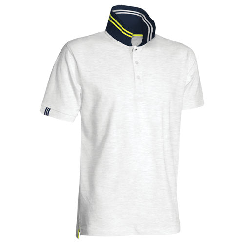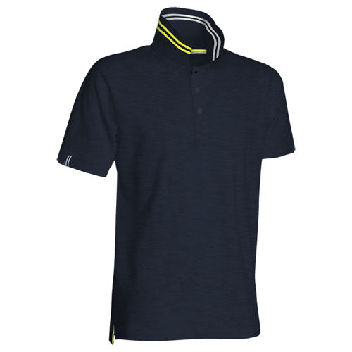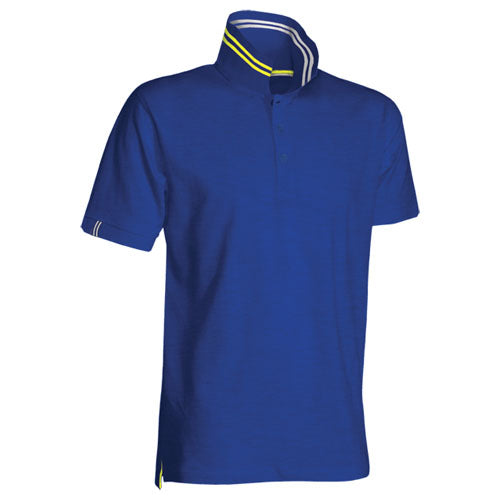 Polo da Bambino manica corta a tre bottoni in tinta effetto perlato, colletto da un lato a righe a contrasto dall‘altro con righe fluorescenti visibili solo se alzato, bordo maniche a costine, la dx con fine inserto, spacchetti laterali e cuciture del collo coperte con nastro fluo, etichetta transert.