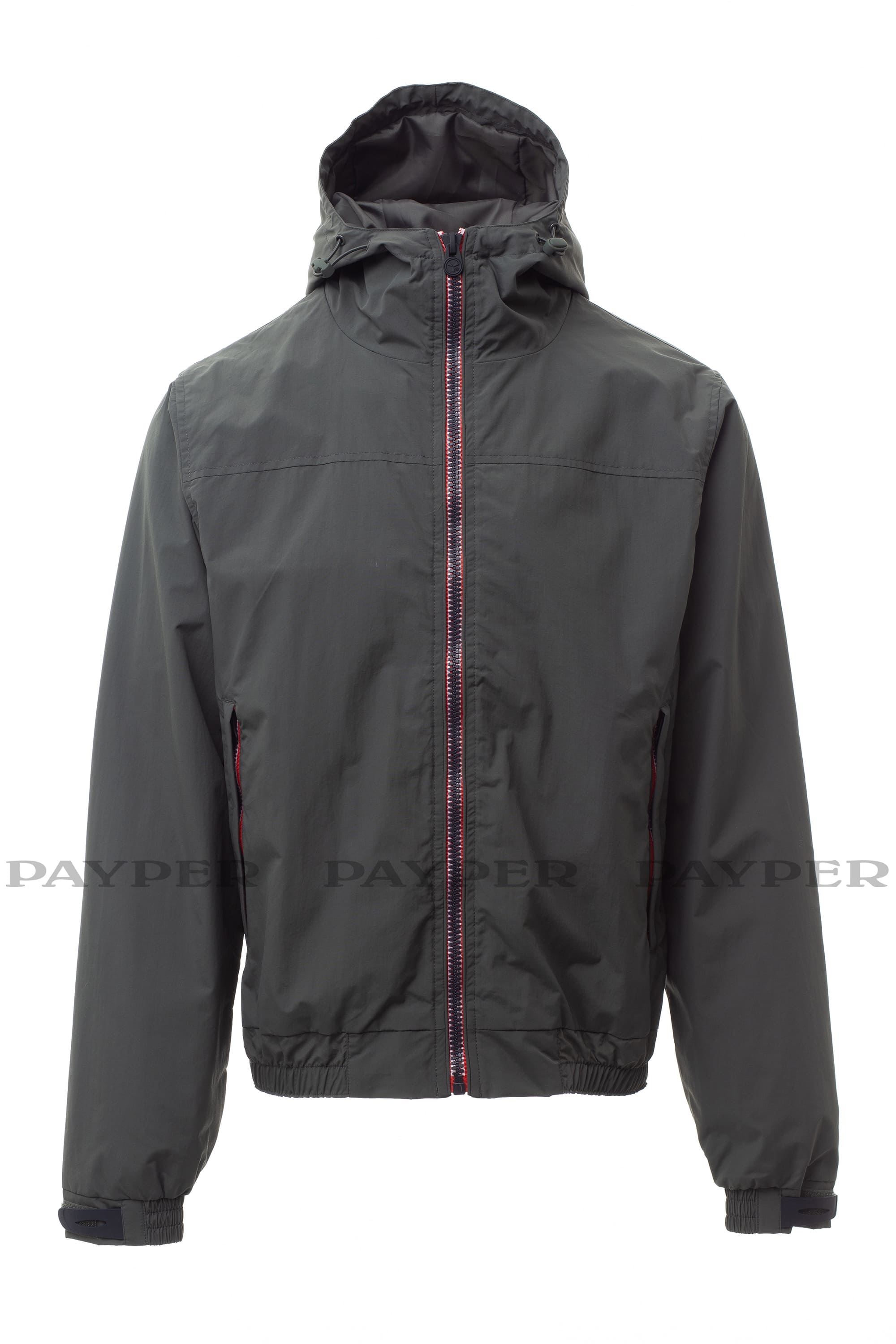Giubbino da uomo, zip da 8 mm in contrasto, cappuccio, elastico in vita, polsini con elastico e stringi polsi gommati di regolazione, due tasche esterne con zip coperta.