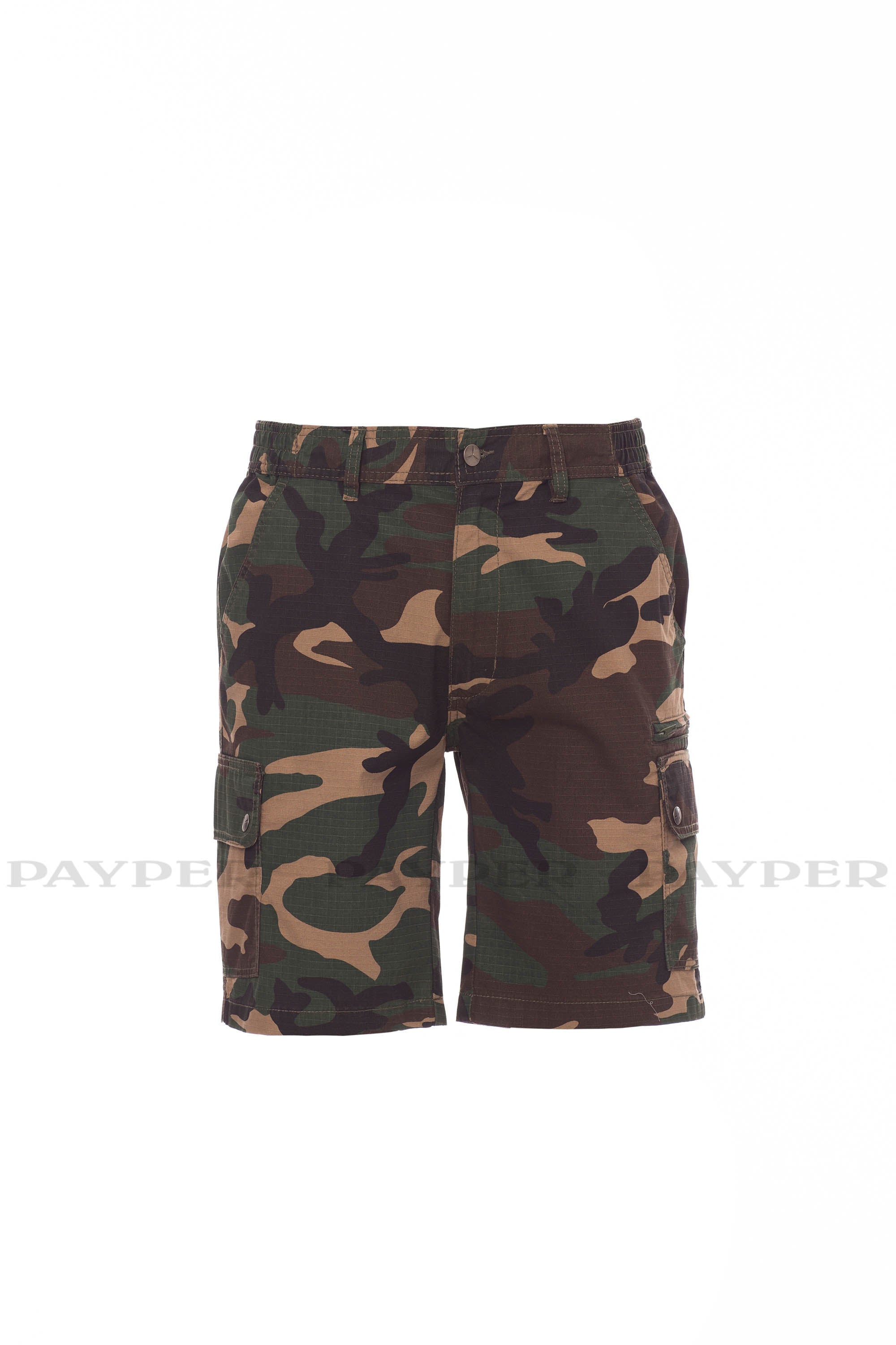 Bermuda con elastici laterali e passanti in vita, chiusura con zip e bottone, due tasche anteriori a taglio classico, due tasconi laterali con patta e bottoni automatici, una tasca secur zip lato sinistro, un portametro a scomparsa lato destro, due tasche posteriori a filo con asola e bottone.