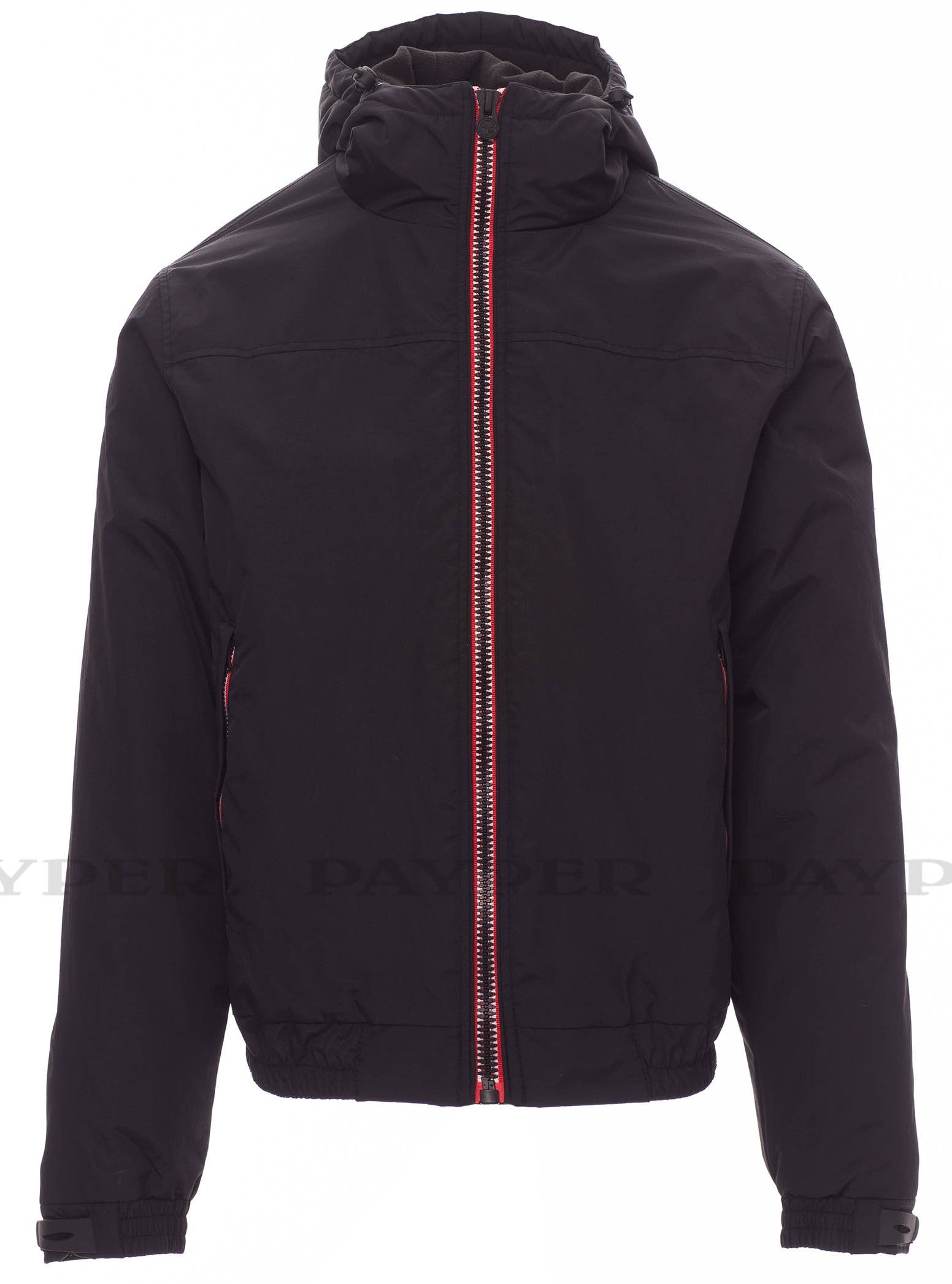 Giubbotto da uomo imbottito, zip da 8mm in contrasto, cappuccio sagomato con due cuciture e coulisse, elastico in vita, polsini con elastico e stringi polsi gommati di regolazione, due tasche esterne con zip coperta. Interno in micropile nel colletto e schiena, una tasca con cerniera porta smartphone con predisposizione per cavo, zip al petto e schiena per agevolare stampe e ricami.