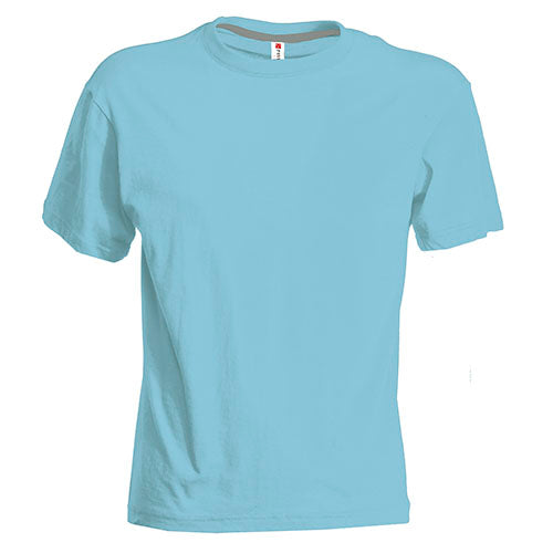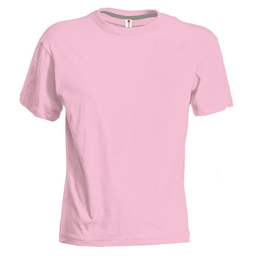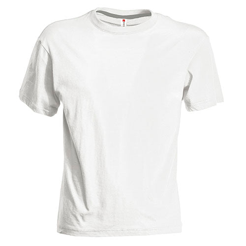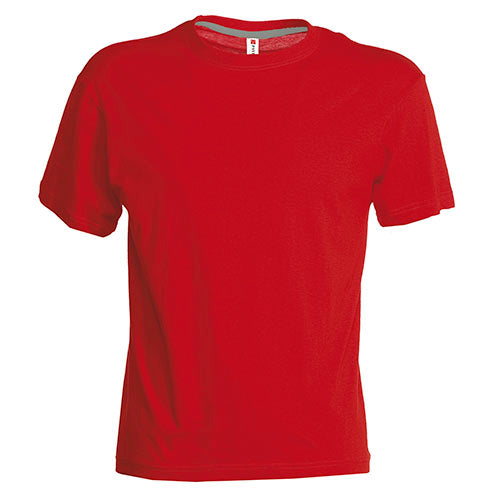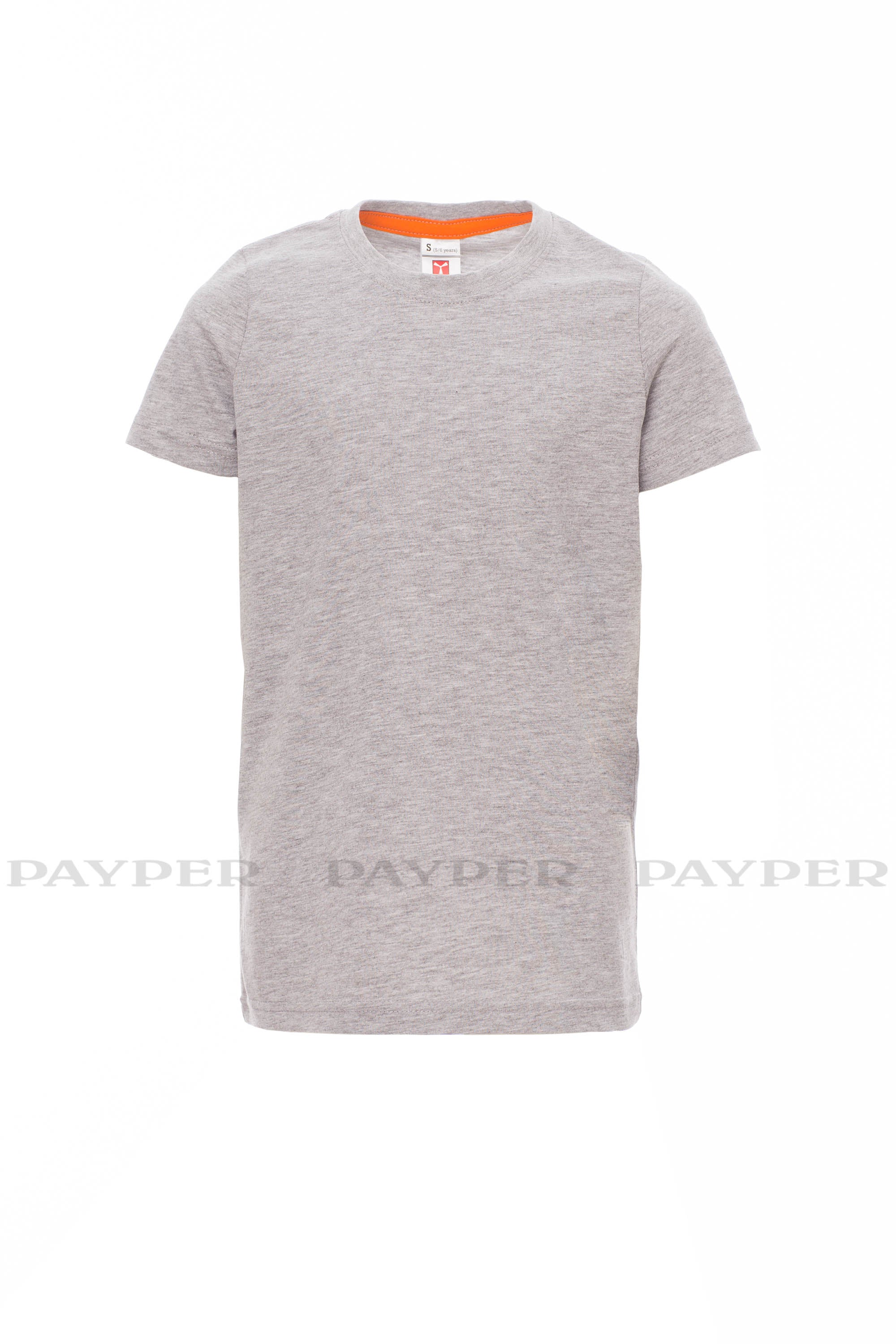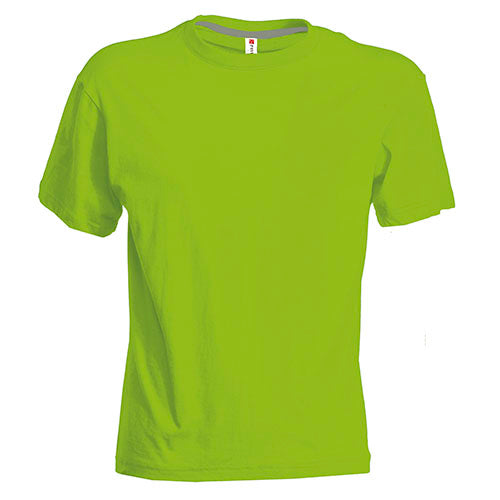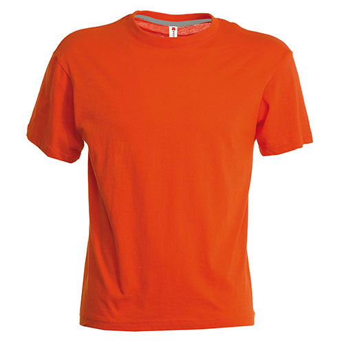 T-shirt da bambino girocollo manica corta, colletto in costina misto spandex da 1,5 cm con cucitura ribattuta sul davanti, nastro di rinforzo da spalla a spalla in colore a contrasto visibile nel colletto, cuciture stretch, struttura tubolare