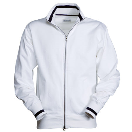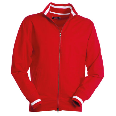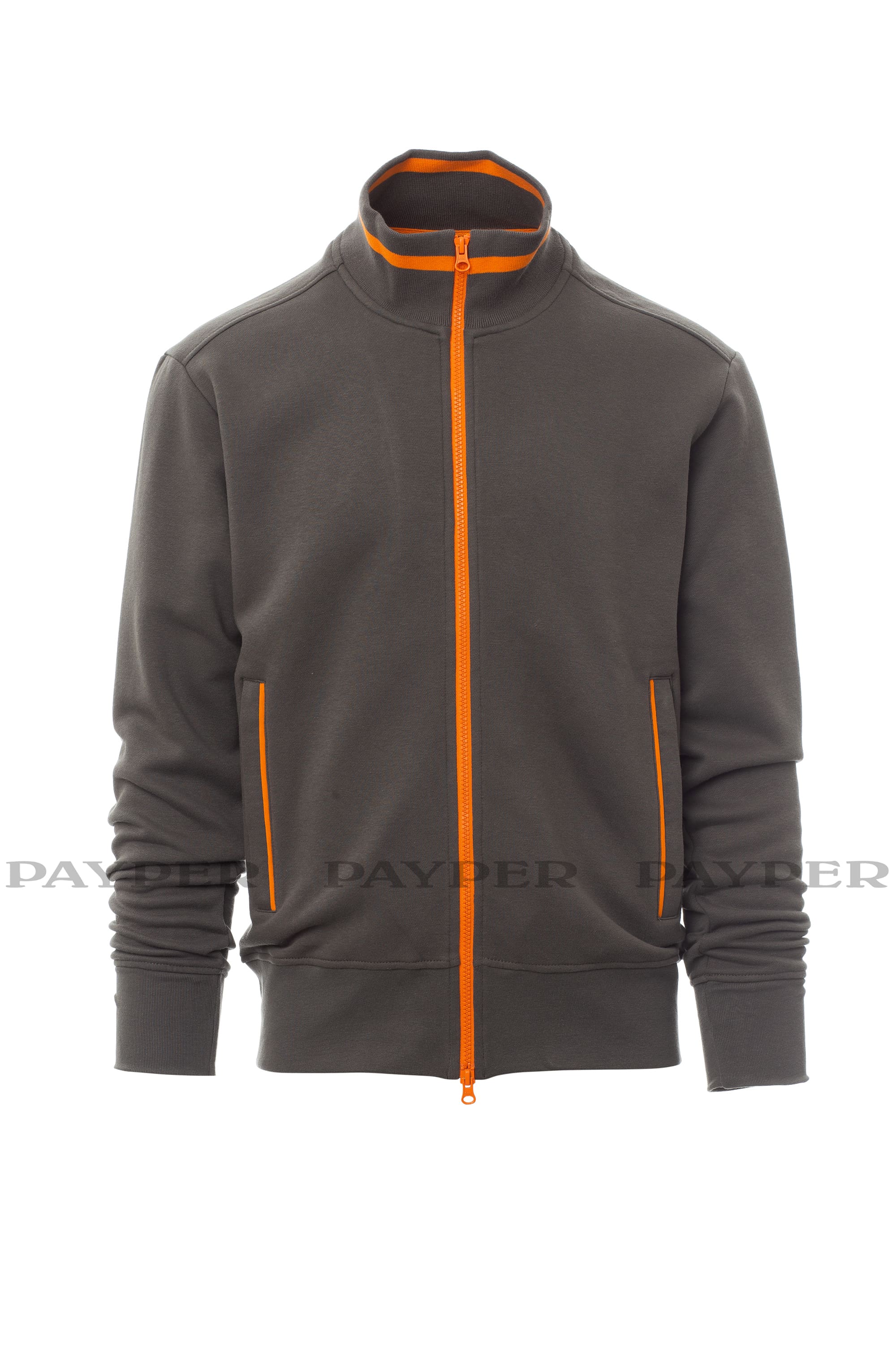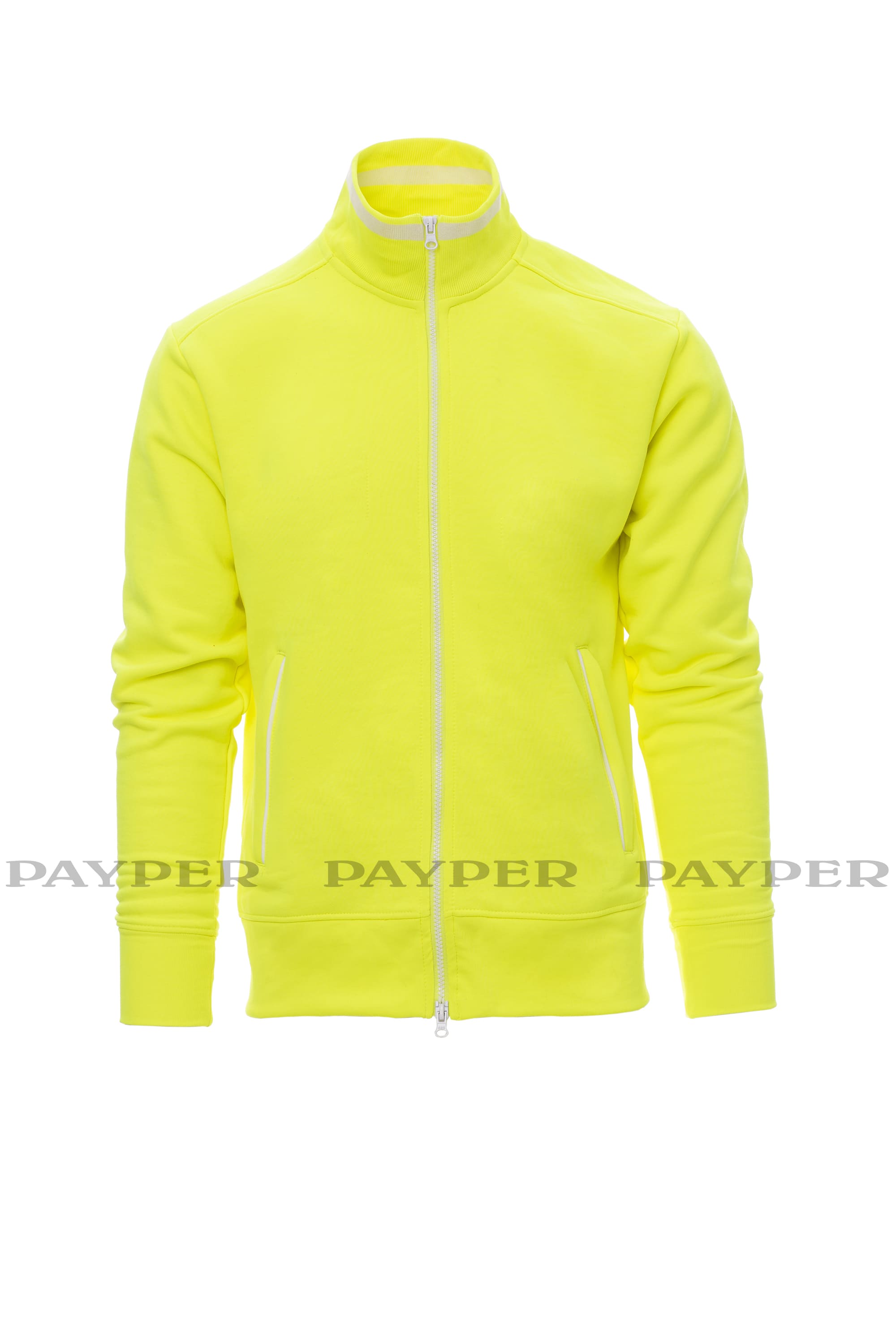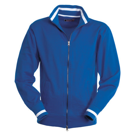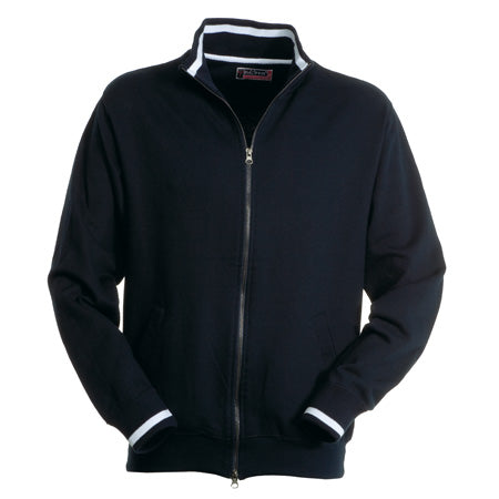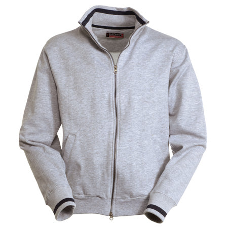Felpa a zip intera di metallo a doppio cursore con polsini e colletto con riga in contrasto, due tasche esterne, polsini e vita in costina elasticizzata, doppia cucitura al collo, alle maniche e in vita e nastro di rinforzo al collo.