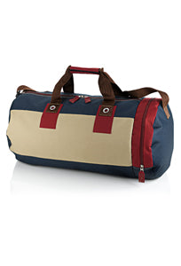 borsone in tessuto 600D con ampia tasca laterale, maniglia imbottita, tracolla regolabile, cuciture zig zag in contrasto, tira zip grandi.