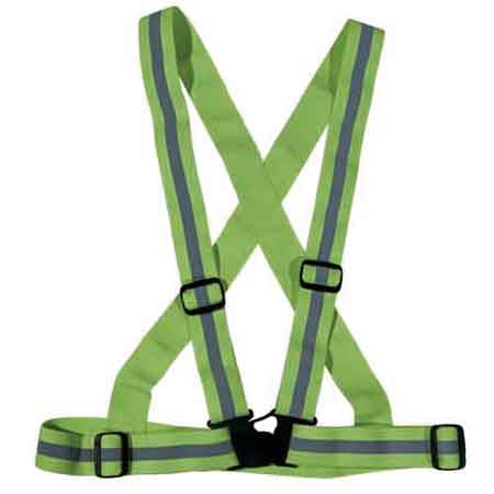 Bretelle elastiche alta visibilità:- 100% Poliestere;- banda riflettente di 1,3 cm di larghezza;- chiusura regolabile frontalmente con chiusura a sgancio rapido