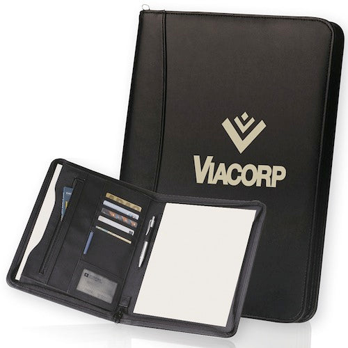 Portadocumenti in A4 con chiusura lampo, comparti per documenti e biglietti da visita. Include blocco note