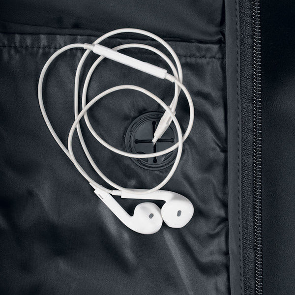 Due taschini interni, polsino con asola, soluzione per auricolari.