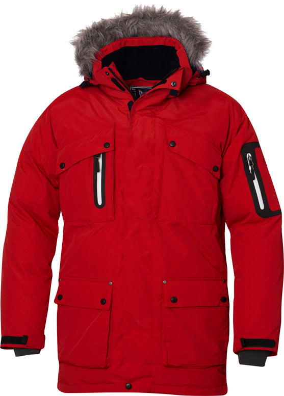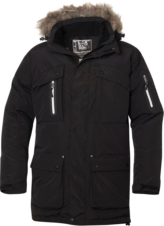 giaccone invernale imbottito stile parka. Cappuccio staccabile con pelliccia ecologica rimovibile. Numerose tasche interne ed esterne con zip e bottoni. polsini interni in maglia.