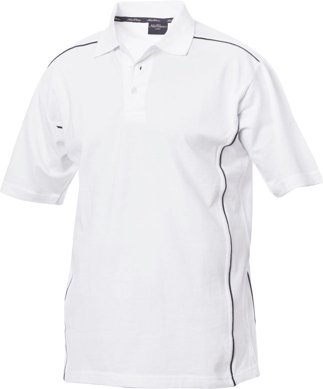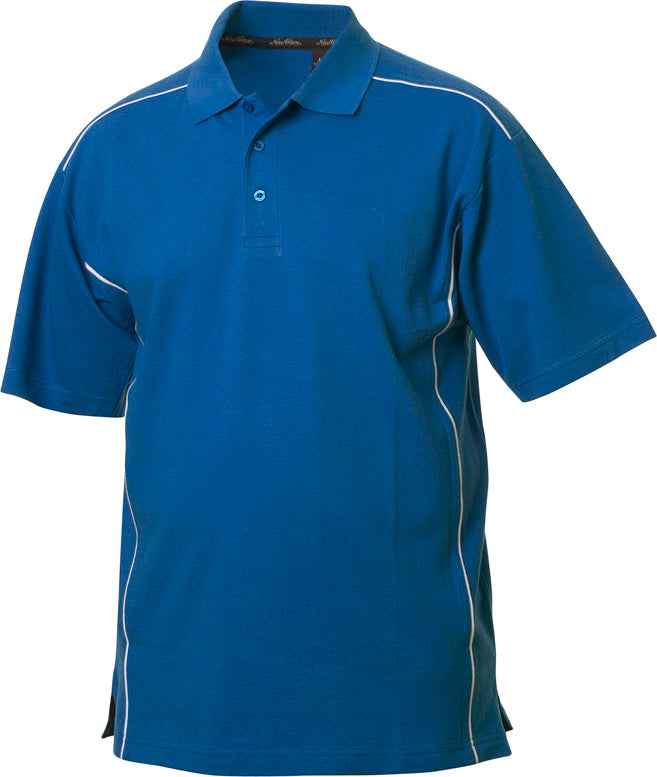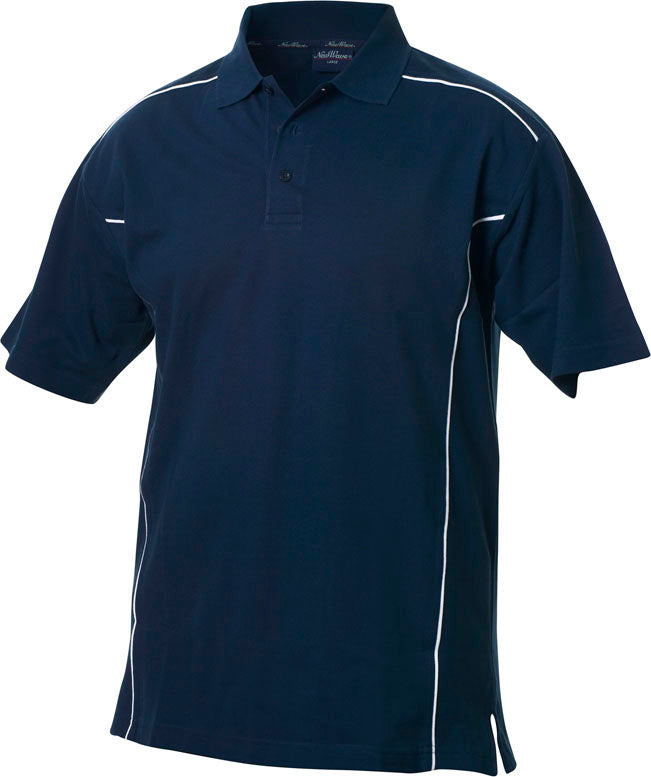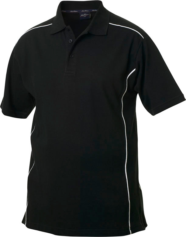 Polo piquet mezze maniche con profilo in contrasto, tre bottoni tono su tono, spacchetti laterali e nastrino sul collo parasudore
