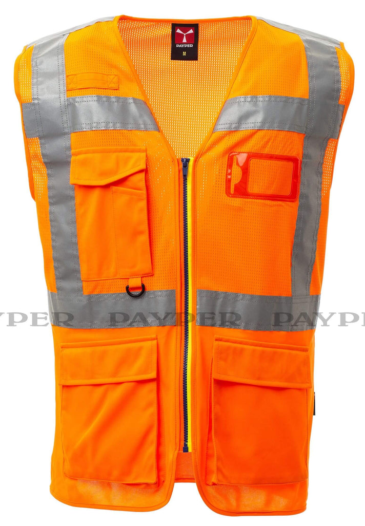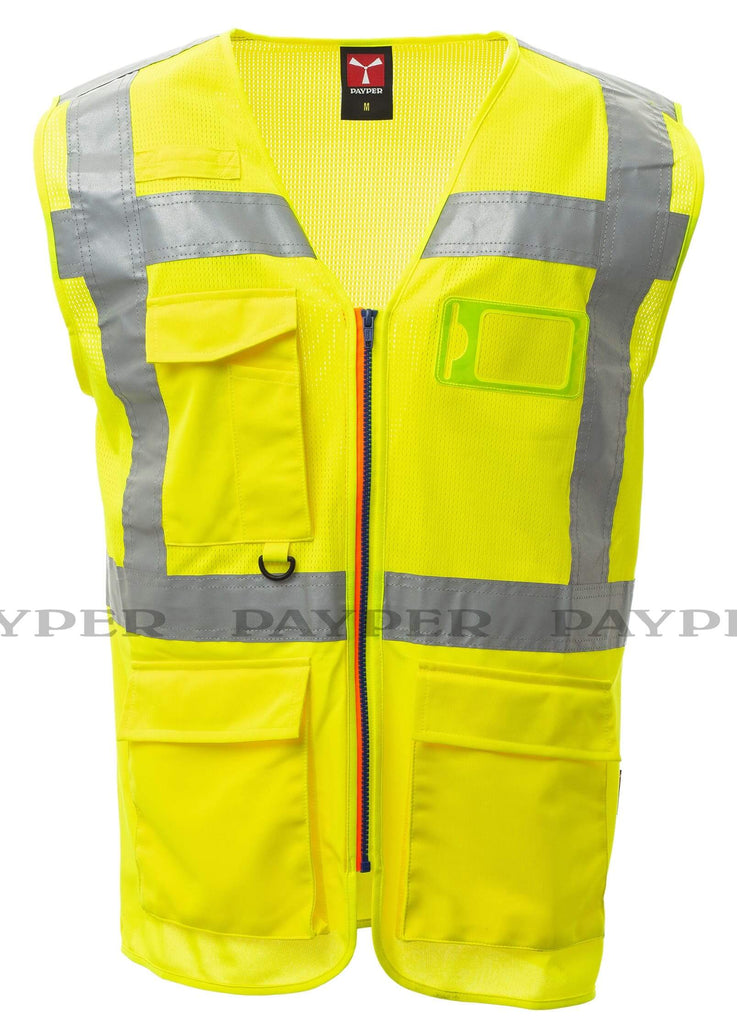 Gilet in alta visibilità realizzato in rete traspirante nella parte superiore e in tessuto dry-tech nella parte inferiore, con bande retroriflettenti orizzontali su spalla, petto e vita e due bande retroriflettenti verticali. Chiusura con zip SBS, con nastro bicolore. Porta badge fisso su petto sinistro a capo indossato. Passante multifunzione, una tasca con porta penne chiusa con velcro e anella su petto destro a capo indossato. Due tasche esterne a soffietto chiuse con velcro nella parte alta ed apertura laterale.