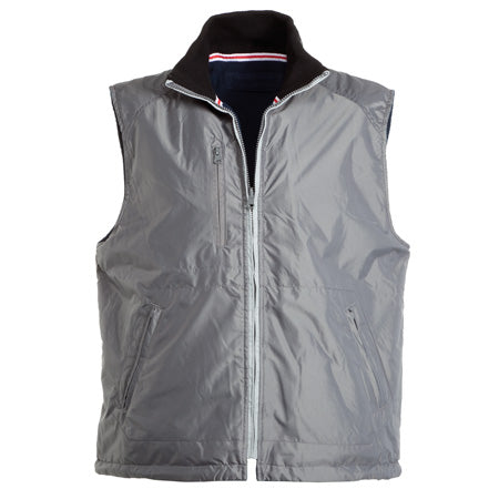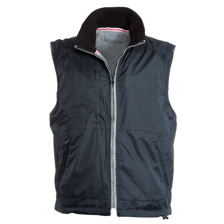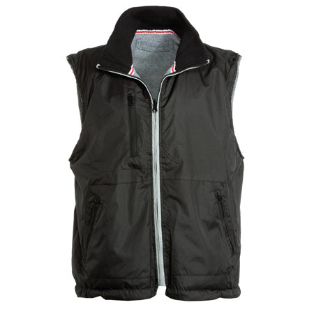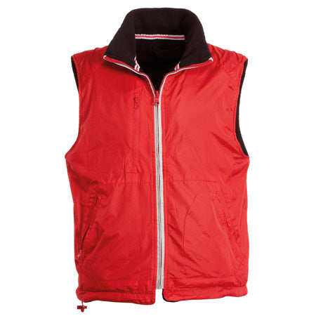 Gilet unisex reversibile, zip in plastica coperta con profilo reflex, coulisse in vita, tre tasche esterne. Interno: in pile, colletto in rib a maglia, due tasche e zip al petto per agevolare stampe e ricami.