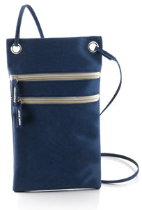 Porta documenti in tessuto 600D con doppio accesso mediante zip, laccio per trasporto al collo, tira zip con impunture in contrasto.