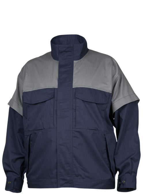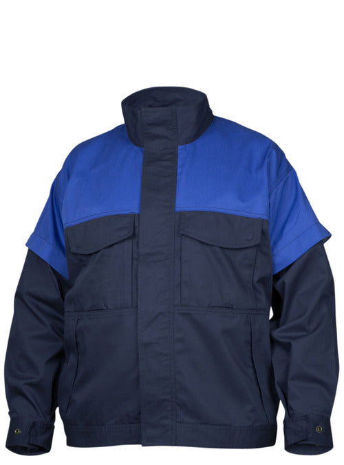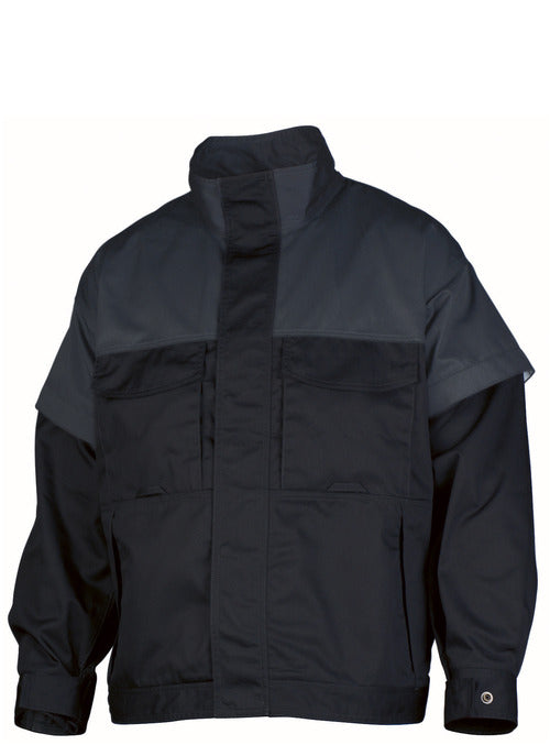 Giacca con cerniera bi-direzionale fino al collo coperta da patella chiusa con bottoni a pressione.