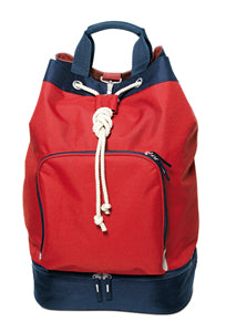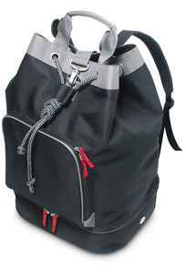 sacca sportiva in tessuto 600D. Comparto principale con spallacci imbottiti e regolabili per doppia funzione sacca/zaino, maniglie imbottite, accesso suplementare nel retro, tasca frontale con zip e chiusura a strozzo con moschettone in metallo. Doppio fondo con fori di aerazione e zip a denti plastici. Tira zip in tessuto con impunture in contrasto.