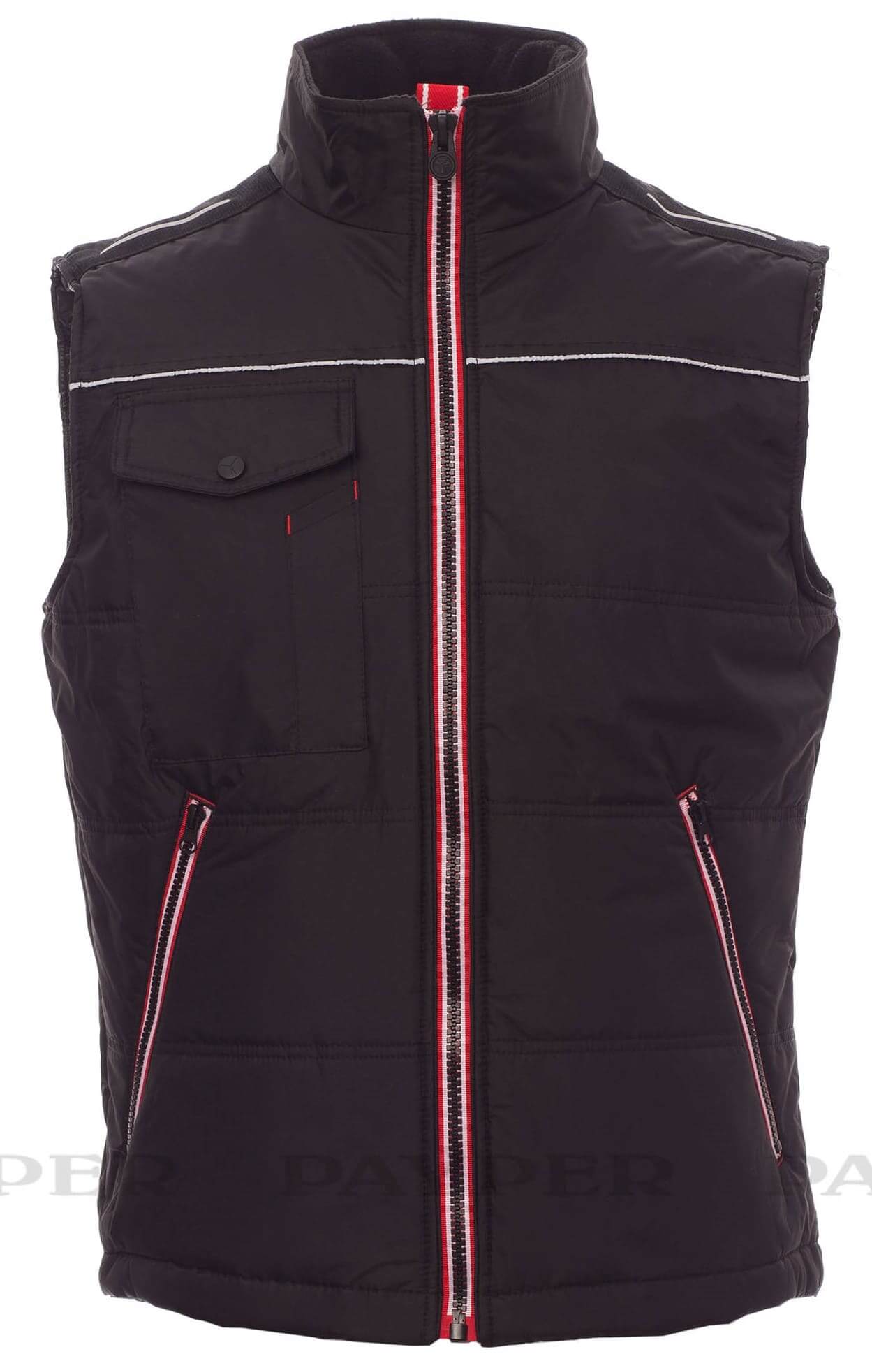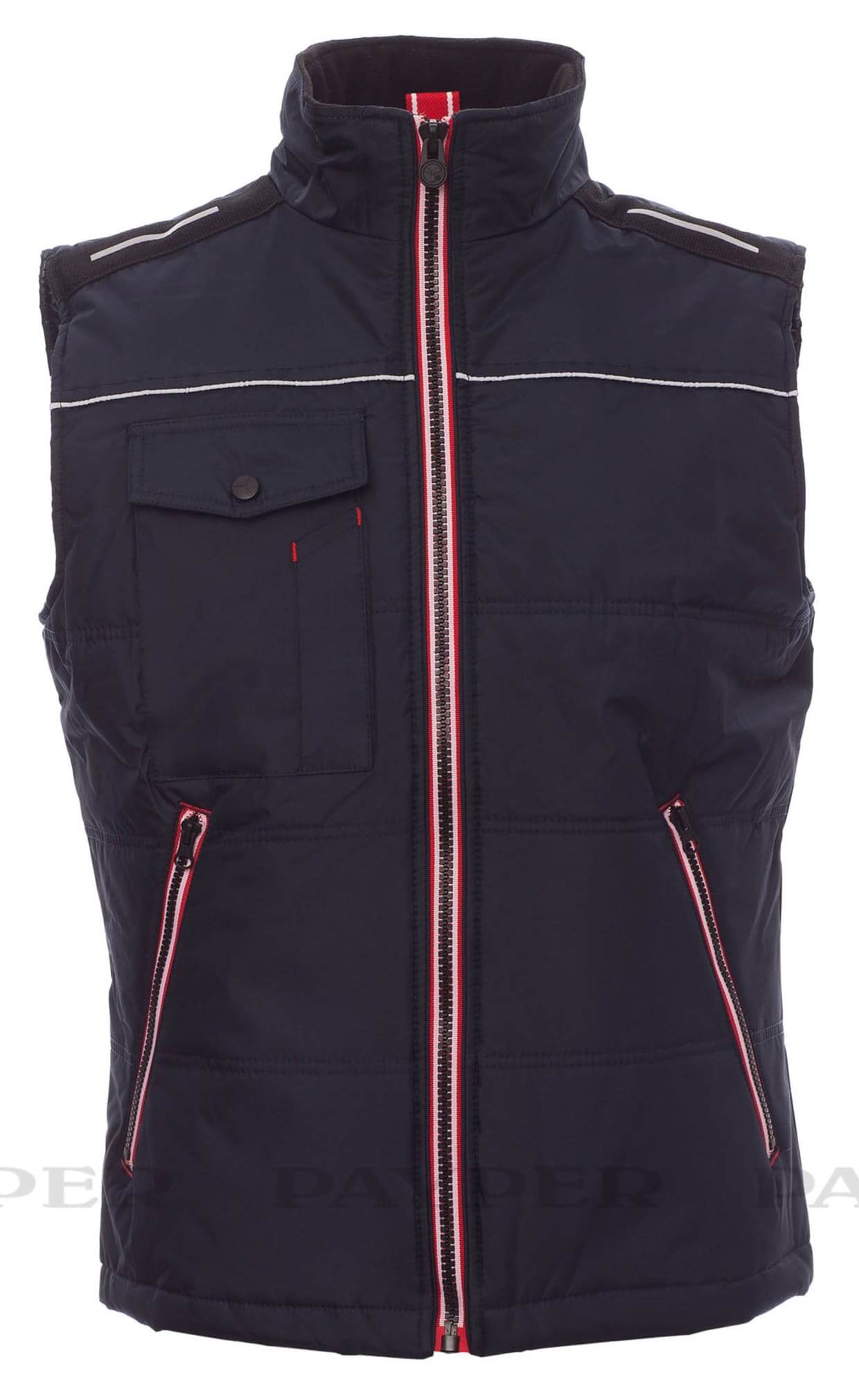 Gilet unisex, zip 8 mm a contrasto, in plastica con cursore in metallo, retro sagomato, due ampie tasche esterne con zip, ampia tasca la petto porta smartphone, anello porta badge, piping reflex al petto e sulla schiena. Interno: imbottitura trapuntata e rifinita con fodera ad alta densità, interno colletto in pile, una tasca.