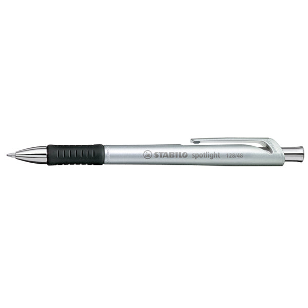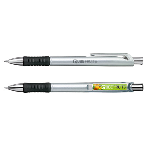 Penna a sfera a scatto in ABS con laccatura metallizzata in argento. Puntale e pulsante in metallo, confortevole impugnatura in santoprene nero. Refill di grande capacità con inchiostro blu.