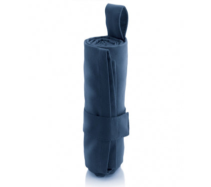 Telo in microfibra da palestra arrotolato e richiuso con velcro per maggiore praticità di trasporto, dotato di anello in tessuto laterale multiuso.