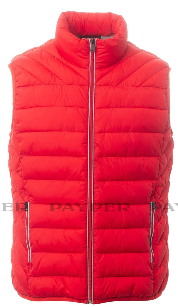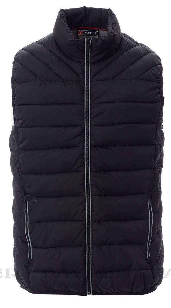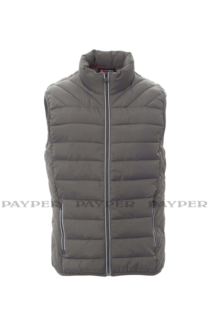 Gilet/piumino da uomo, zip 5mm in plastica con cursore in metallo, fine bordino in vita, due tasche esterne. Interno: imbottito di poliestere effetto piuma, due tasche.