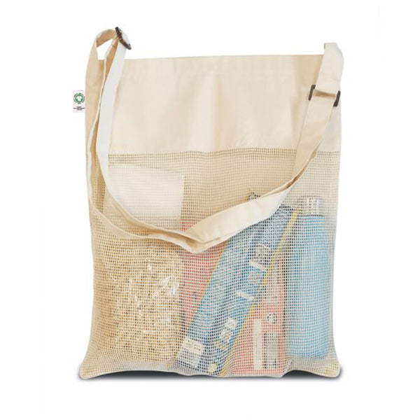 Tracolla in Cotone Organico 100%, colore naturale, parte frontale in rete, tracolla regolabile tramite fibbie in Legno.