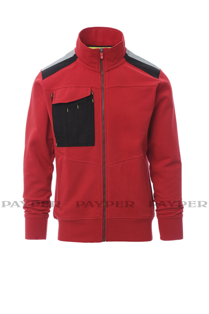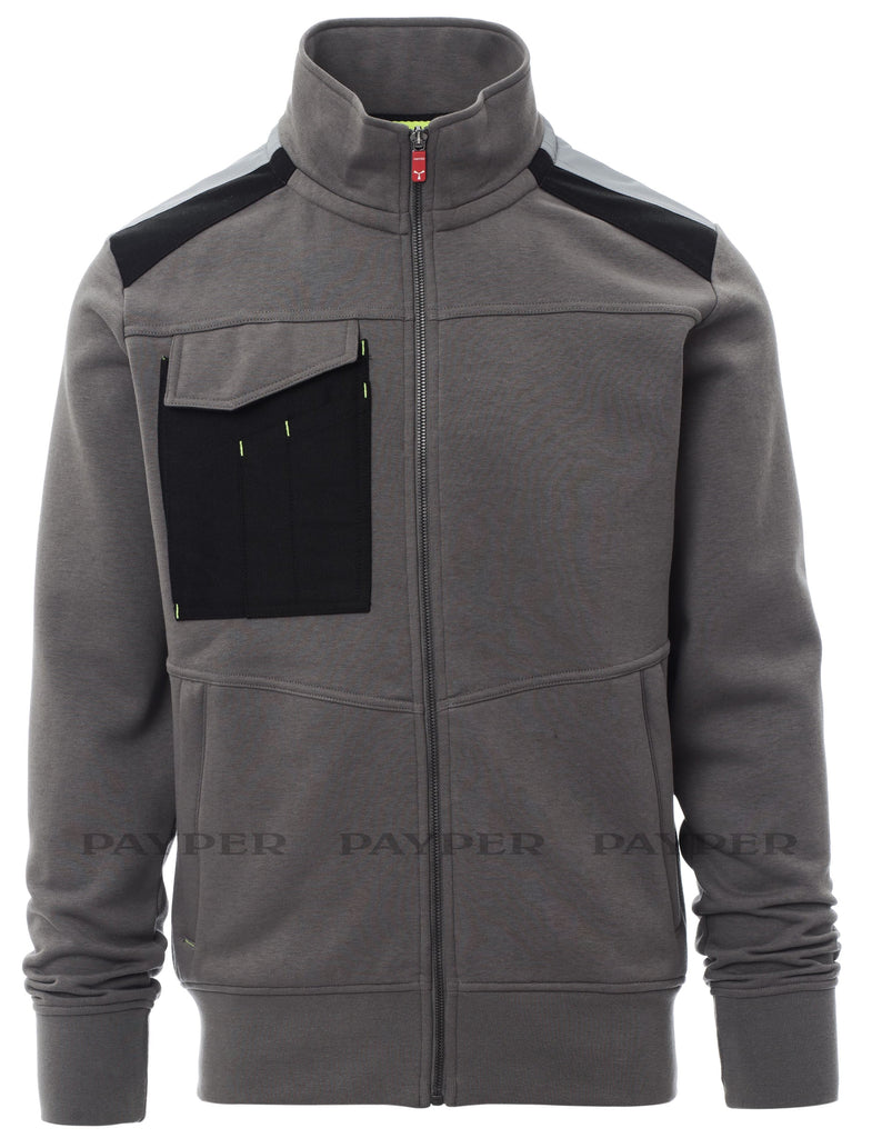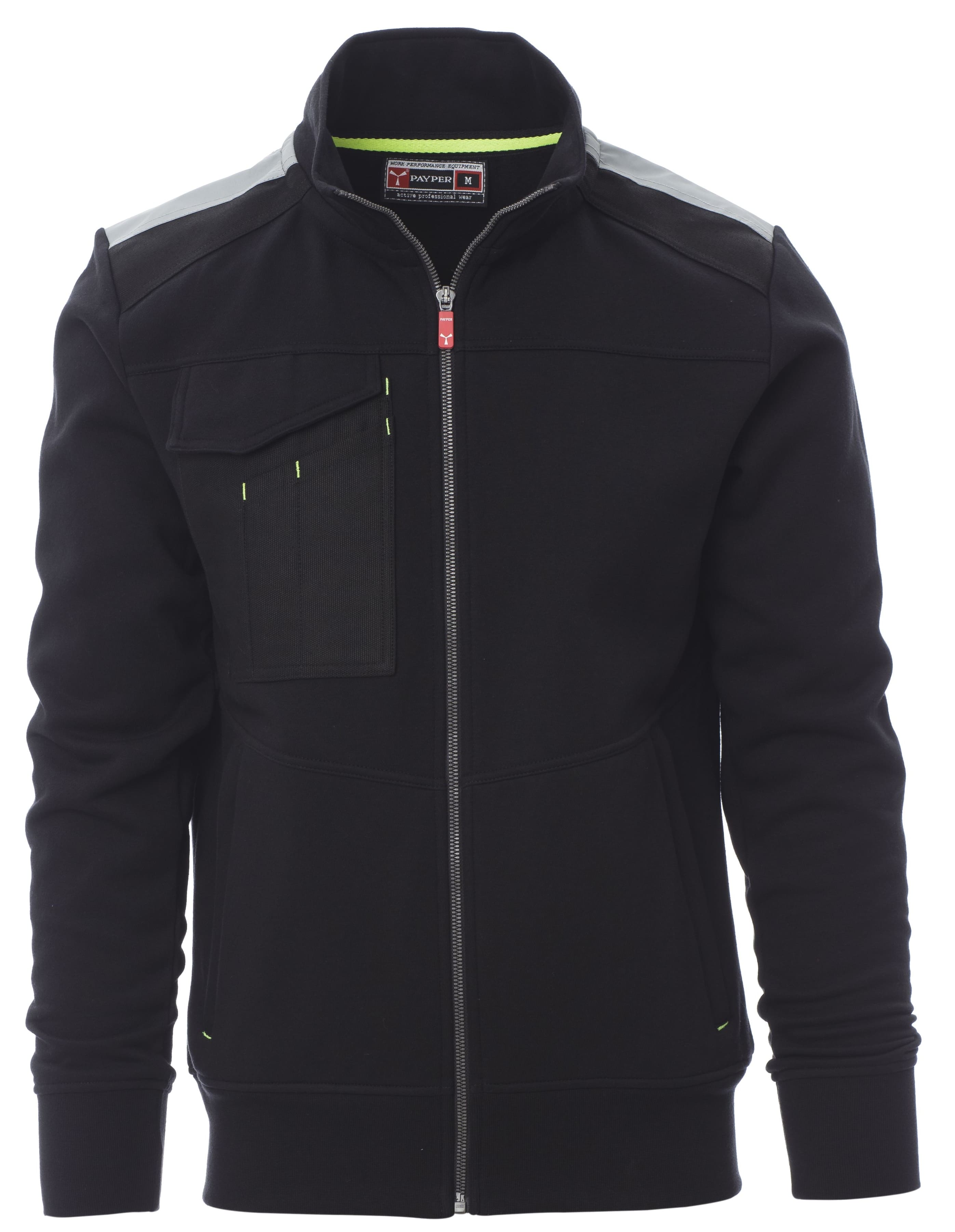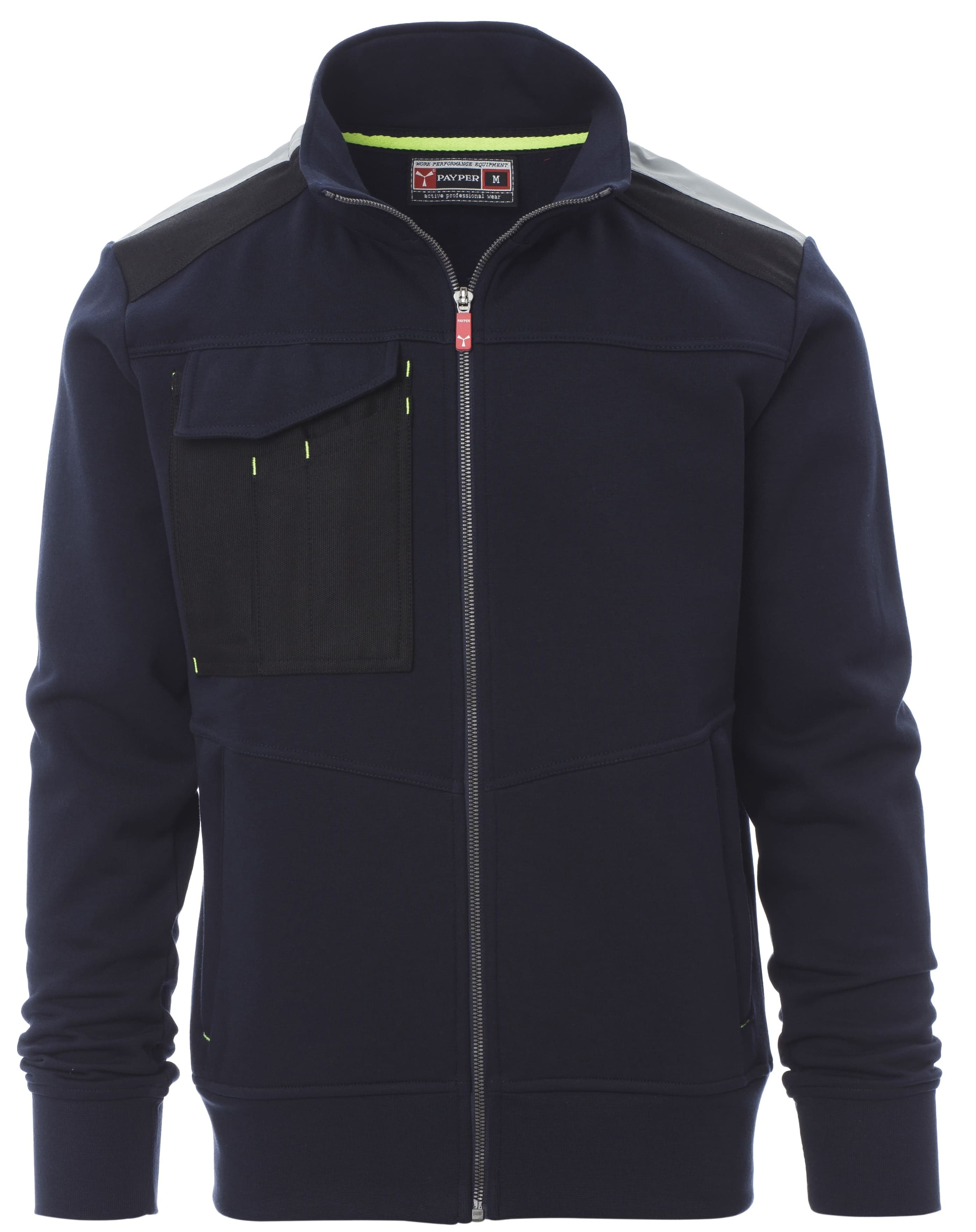 Felpa da uomo, zip intera SBS in plastica con cursore in metallo “semi-autolock”, due tasche con cerniera, una tasca multifunzione al petto con porta badge a scomparsa e patta di chiusura LOCK SYSTEM, bande riflettenti alle spalle, polsini e vita in costina elasticizzata, doppia cucitura al collo, alle maniche e in vita e nastro di rinforzo al collo. Trattamento del tessuto water repellent.