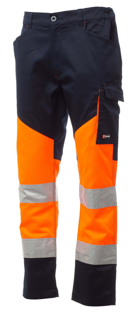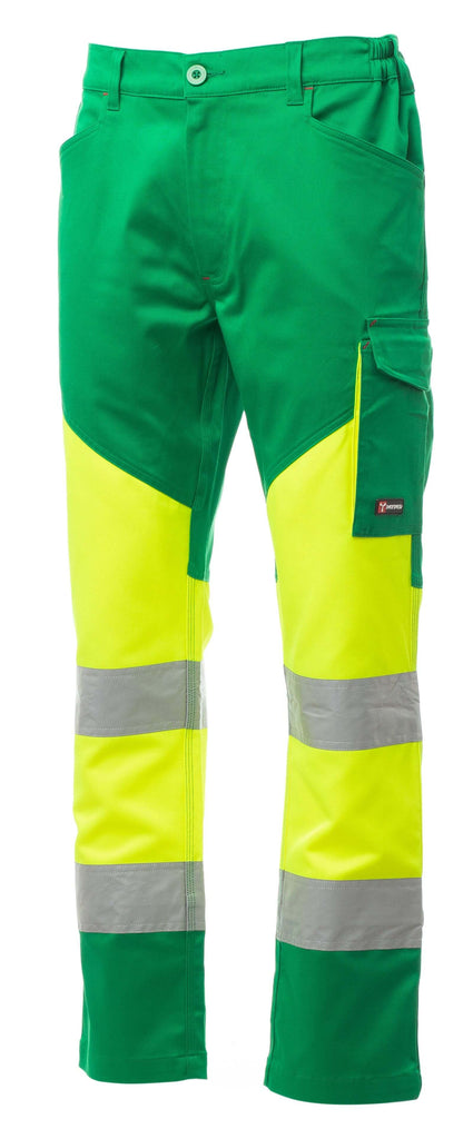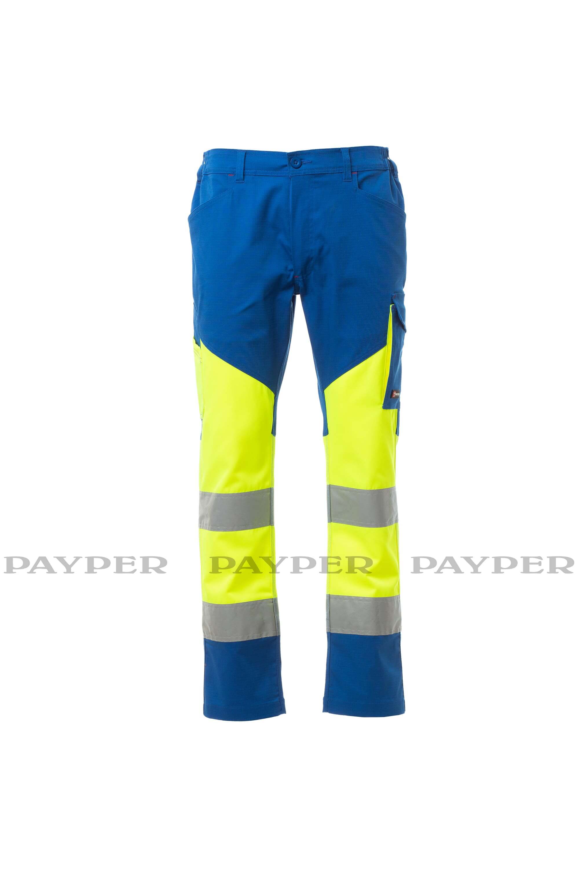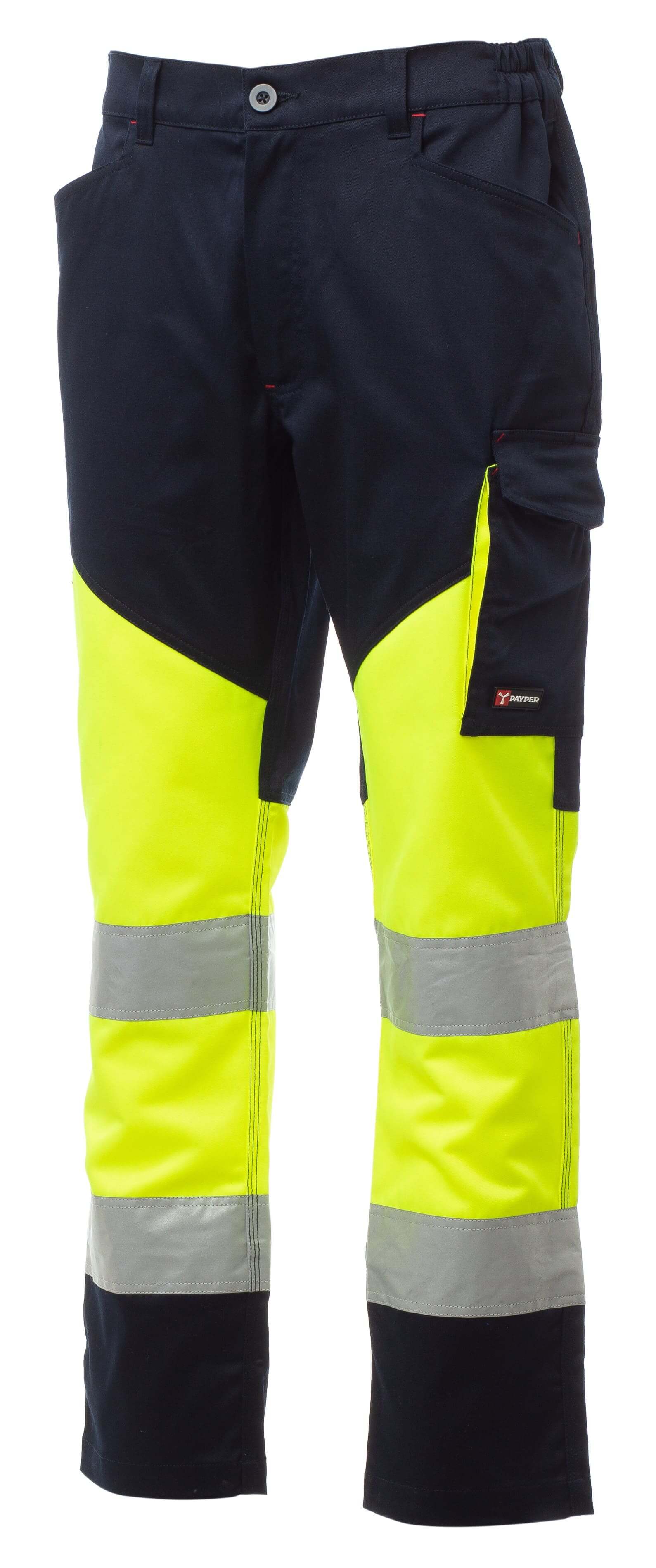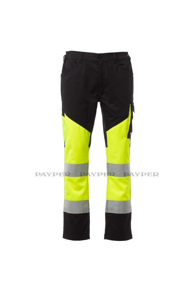 Pantalone unisex estivo, bicolore, in alta visibilità, bande retroriflettenti, elastici laterali e passanti in vita. Chiusura con zip e bottone in plastica, due tasche anteriori sagomate, una tasca laterale con chiusura LOCK SYSTEM e porta badge estraibile e un’altra con doppio porta metro. Due tasche posteriori: una aperta con bande retroriflettenti e una con patta e velcro. Cuciture in tono al tessuto di contrasto. Cavallo e interno gamba con cuciture a triplo ago. La taglia internazionale L ha un interno gamba di 80 cm.