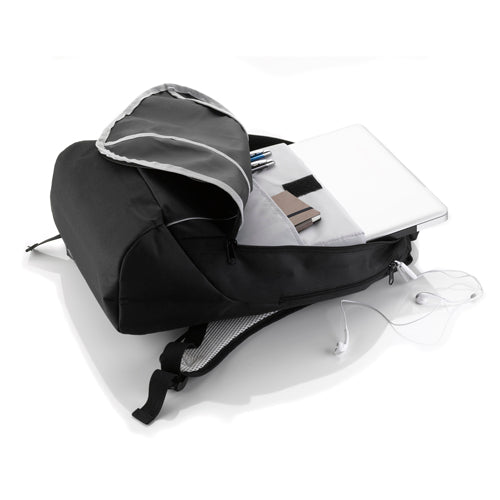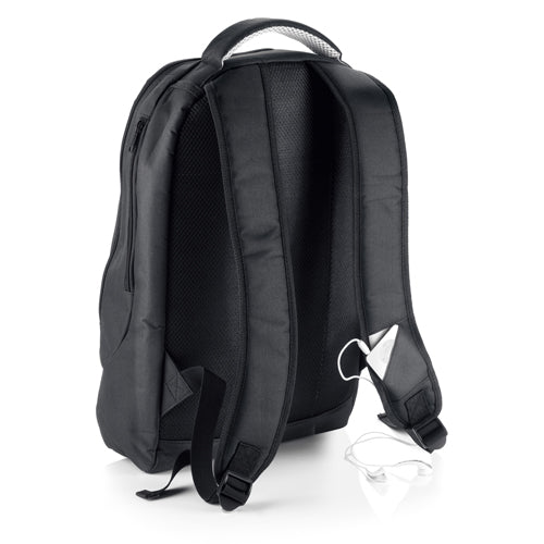 Spallacci ergonomici e schienale foderati in materiale traspirante, maniglia imbottita, tira zip in tessuto con impunture in contrasto.
